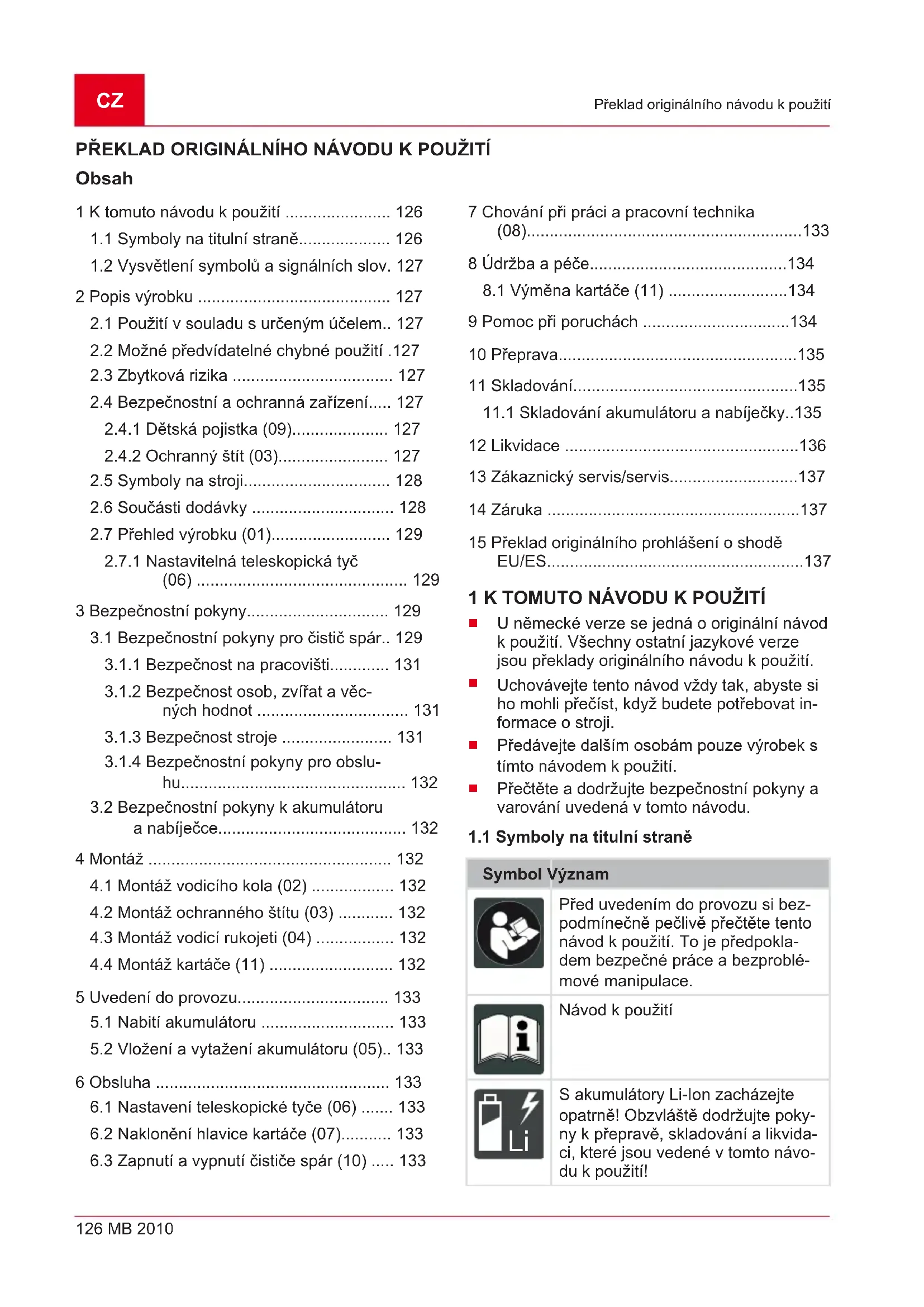 Akumulátor skladujte v chladu a su- chu, nikdy však ne u otevřeného ohně nebo zdroje tepla.CZ 136 MB 2010 Likvidace UPOZORNĚNÍ Akumulátor je při nabíjení chráněn vůči přebíjení automatickým rozpoznáním stavu nabití, a může tak určitou dobu zů- stat spojený s nabíječkou, ne však dlou- hodobě. UPOZORNĚNÍ Dodržujte samostatné návody k použí- vání akumulátoru a nabíječky.