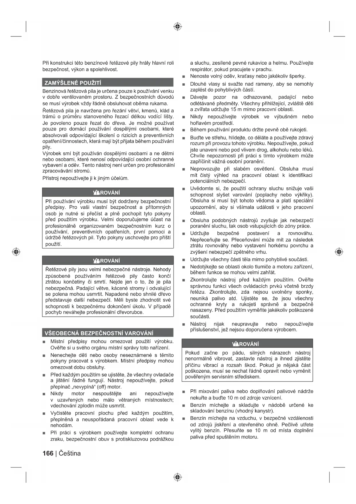 ■ Místní předpisy mohou omezovat použití výrobku. Ověřte si u svého orgánu místní správy toto nařízení. ■ Nenechejte děti nebo osoby neseznámené s těmito pokyny pracovat s výrobkem. Místní předpisy mohou omezovat dobu obsluhy. ■ Před každým použitím se ujistěte, že všechny ovladače a jištění řádně fungují. Nástroj nepoužívejte, pokud přepínač „nevypíná“ (off) motor. ■ Nikdy motor nespouštějte ani nepoužívejte v uzavřených nebo málo větraných místnostech; vdechování zplodin může usmrtit. ■ Vyčistěte pracovní plochu před každým použitím, přeplněná a neuspořádaná pracovní oblast vede k nehodám. ■ Při práci s výrobkem používejte kompletní ochranu zraku, bezpečnostní obuv s protiskluzovou podrážkou a sluchu, zesílené pevné rukavice a helmu. Používejte respirátor, pokud pracujete v prachu. ■ Nenoste volný oděv, kraťasy nebo jakékoliv šperky. ■ Dlouhé vlasy si svažte nad rameny, aby se nemohly zaplést do pohyblivých částí. ■ Dávejte pozor na odhazované, padající nebo odlétávané předměty. Všechny přihlížející, zvláště děti a zvířata udržujte 15 m mimo pracovní oblasti. ■ Nikdy nepoužívejte výrobek ve výbušném nebo hořlavém prostředí. ■ Během používání produktu držte pevně obě rukojeti. ■ Buďte ve střehu, hlídejte, co děláte a používejte zdravý rozum při provozu tohoto výrobku. Nepoužívejte, pokud jste unaveni nebo pod vlivem drog, alkoholu nebo léků. Chvíle nepozornosti při práci s tímto výrobkem může zapříčinit vážná osobní poranění. ■ Neprovozujte při slabém osvětlení. Obsluha musí mít čistý výhled na pracovní oblast k identifikaci potenciálních nebezpečí. ■ Uvědomte si, že použití ochrany sluchu snižuje vaši schopnost slyšet varování (poplachy nebo výkřiky). Obsluha si musí být tohoto vědoma a platí speciální upozornění, aby si všímala události v jeho pracovní oblasti. ■ Obsluha podobných nástrojů zvyšuje jak nebezpečí poranění sluchu, tak osob vstupujících do zóny práce. ■ Udržujte bezpečné postavení a rovnováhu. Nepřeceňujte se. Přeceňování může mít za následek ztrátu rovnováhy nebo vystavení horkému povrchu a zvýšení nebezpečí zpětného vrhu. ■ Udržujte všechny části těla mimo pohyblivé součásti. ■ Nedotýkejte se oblasti okolo tlumiče a motoru zařízení, během funkce se mohou velmi zahřát. ■ Zkontrolujte nástroj před každým použitím. Ověřte správnou funkci všech ovládacích prvků včetně brzdy řetězu. Zkontrolujte, zda nejsou uvolněny sponky, neuniká palivo atd. Ujistěte se, že jsou všechny ochranné kryty a rukojeti správně a bezpečně nasazeny. Před použitím vyměňte jakékoliv poškozené součásti. ■ Nástroj nijak neupravujte nebo nepoužívejte příslušenství, jež nejsou doporučena výrobcem. VAROVÁNÍ Pokud začne po pádu, silných nárazech nástroj nenormálně vibrovat, zastavte nástroj a ihned zjistěte příčinu vibrací a rozsah škod. Pokud je nějaká část poškozena, musí se nechat řádně opravit nebo vyměnit pověřeným servisním střediskem. ■ Při mixování paliva nebo doplňování palivové nádrže nekuřte a buďte 10 m od zdroje vznícení. ■ Benzín míchejte a skladujte v nádobě určené ke skladování benzínu (vhodný kanystr). ■ Benzín míchejte na vzduchu, v bezpečné vzdálenosti od zdrojů jiskření a otevřeného ohně. Pečlivě utřete vylitý benzín. Přesuňte se 10 m od místa doplnění paliva před spuštěním motoru.167 Čeština |