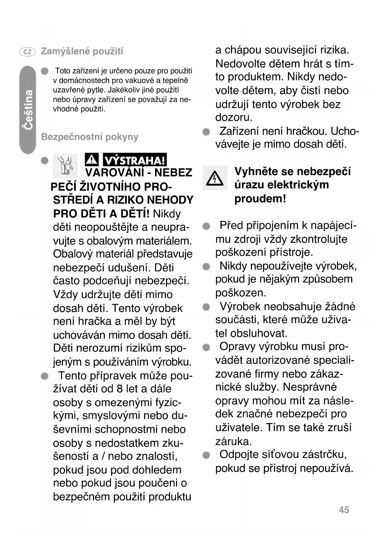 Svensk45 Zamýšlené použití Toto zařízení je určeno pouze pro použití v domácnostech pro vakuové a tepelně uzavřené pytle. Jakékoliv jiné použití nebo úpravy zařízení se považují za ne- vhodné použití. Bezpečnostní pokyny