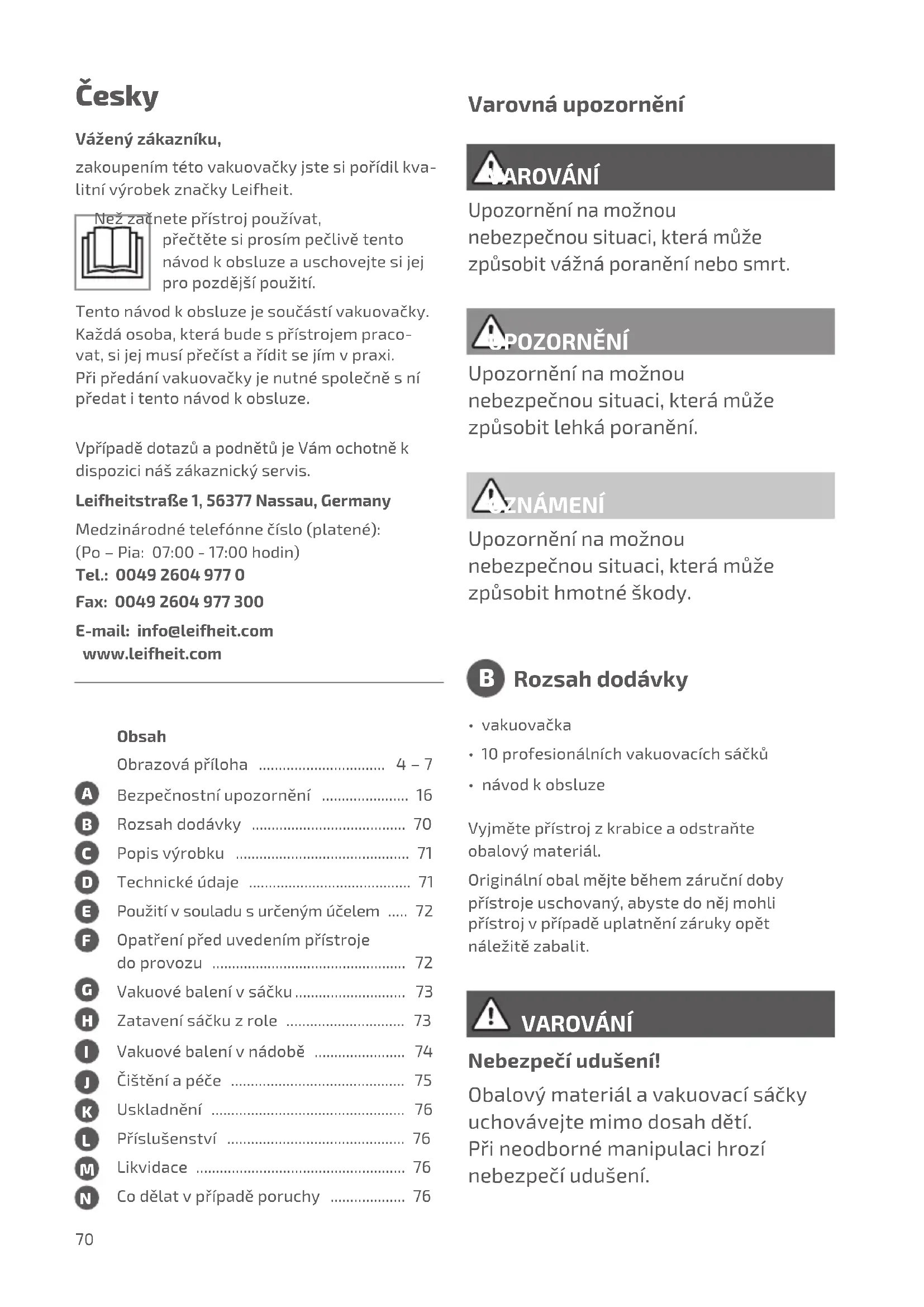 - Ze erop toe dat de rand van het bakje voldo- ende schoon is. Als alle bovengenoemde situaties kunnen worden uitgesloten, gelieve u contact op te nemen met het aangegeven servicepunt. NL70 ObsahObrazová příloha ................................ 4 – 7Bezpečnostní upozornění ...................... 16Rozsah dodávky ....................................... 70Popis výrobku ............................................ 71Technické údaje ......................................... 71Použití v souladu s určeným účelem ..... 72Opatření před uvedením přístroje do provozu ................................................. 72 Vakuové balení v sáčku ............................ 73 Zatavení sáčku z role .............................. 73 Vakuové balení v nádobě ....................... 74 Čištění a péče ............................................ 75 Uskladnění ................................................. 76 Příslušenství ............................................. 76Likvidace ..................................................... 76Co dělat v případě poruchy ................... 76 Česky Vážený zákazníku,zakoupením této vakuovačky jste si pořídil kva-litní výrobek značky Leifheit. Než začnete přístroj používat, přečtěte si prosím pečlivě tento návod k obsluze a uschovejte si jej pro pozdější použití. Tento návod k obsluze je součástí vakuovačky. Každá osoba, která bude s přístrojem praco-vat, si jej musí přečíst a řídit se jím v praxi. Při předání vakuovačky je nutné společně s ní předat i tento návod k obsluze. VAROVÁNÍ