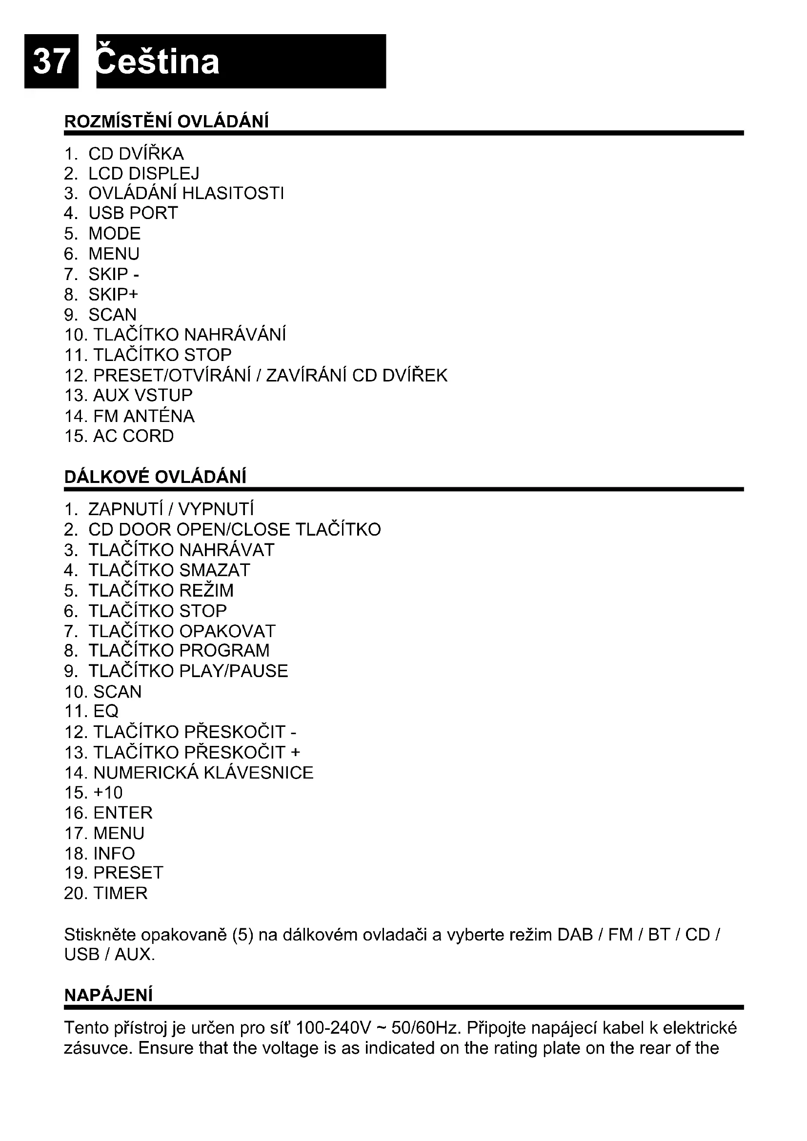 Stiskněte opakovaně (5) na dálkovém ovladači a vyberte režim DAB / FM / BT / CD / USB / AUX. NAPÁJENÍ Tento přístroj je určen pro síť 100-240V ~ 50/60Hz. Připojte napájecí kabel k elektrické zásuvce. Ensure that the voltage is as indicated on the rating plate on the rear of the38 Čeština unit.Ujistěte se, že napětí je stejné, jak je uvedeno na typovém štítku na zadní straně přístroje. Tento přístroj disponuje dvěma režimy: Standby: Displej ukazuje aktuální čas. Reproduktor a osvětlení pozadí jsou vypnuty. Přehrávání: Modré osvětlení pozadí je zapnuto, lze poslouchat hudbu. Pokud není hudba přehrávána, přístroj se po 15 minutách automaticky přepne do reži- mu Standby. Chcete-li přepínat mezi režim přehrávání a pohotovostním režimu stiskněte a podržte tlačítko OVLÁDÁNÍ HLASITOSTI (3) nebo tlačítko ON/OFF (1) na dálkovém ovladači.