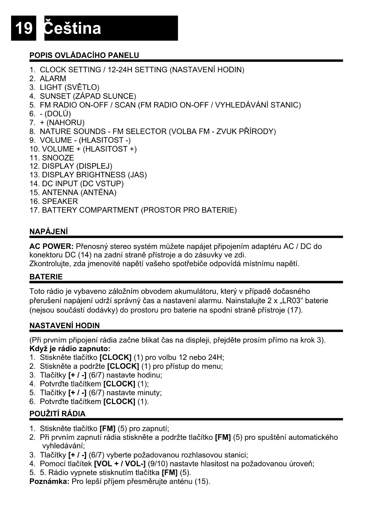 NAPÁJENÍ AC POWER: Přenosný stereo systém můžete napájet připojením adaptéru AC / DC do konektoru DC (14) na zadní straně přístroje a do zásuvky ve zdi. Zkontrolujte, zda jmenovité napětí vašeho spotřebiče odpovídá místnímu napětí. BATERIE Toto rádio je vybaveno záložním obvodem akumulátoru, který v případě dočasného přerušení napájení udrží správný čas a nastavení alarmu. Nainstalujte 2 x „LR03“ baterie (nejsou součástí dodávky) do prostoru pro baterie na spodní straně přístroje (17). NASTAVENÍ HODIN (Při prvním připojení rádia začne blikat čas na displeji, přejděte prosím přímo na krok 3). Když je rádio zapnuto: