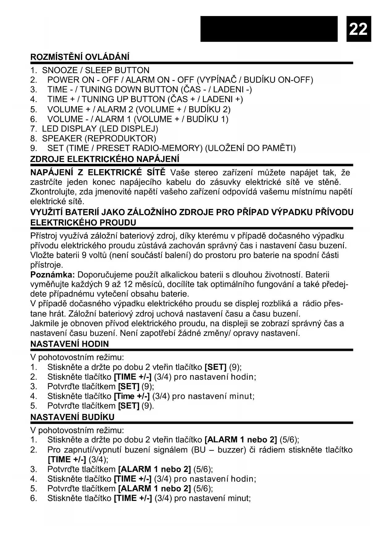 Přístroj využívá záložní bateriový zdroj, díky kterému v případě dočasného výpadku přívodu elektrického proudu zůstává zachován správný čas i nastavení času buzení. Vložte baterii 9 voltů (není součástí balení) do prostoru pro baterie na spodní části přístroje. Poznámka: Doporučujeme použít alkalickou baterii s dlouhou životností. Baterii vyměňujte každých 9 až 12 měsíců, docílíte tak optimálního fungování a také předej- dete případnému vytečení obsahu baterie. V případě dočasného výpadku elektrického proudu se displej rozbliká a rádio přes- tane hrát. Záložní bateriový zdroj uchová nastavení času a času buzení. Jakmile je obnoven přívod elektrického proudu, na displeji se zobrazí správný čas a nastavení času buzení. Není zapotřebí žádné změny/ opravy nastavení. NASTAVENÍ HODIN V pohotovostním režimu: