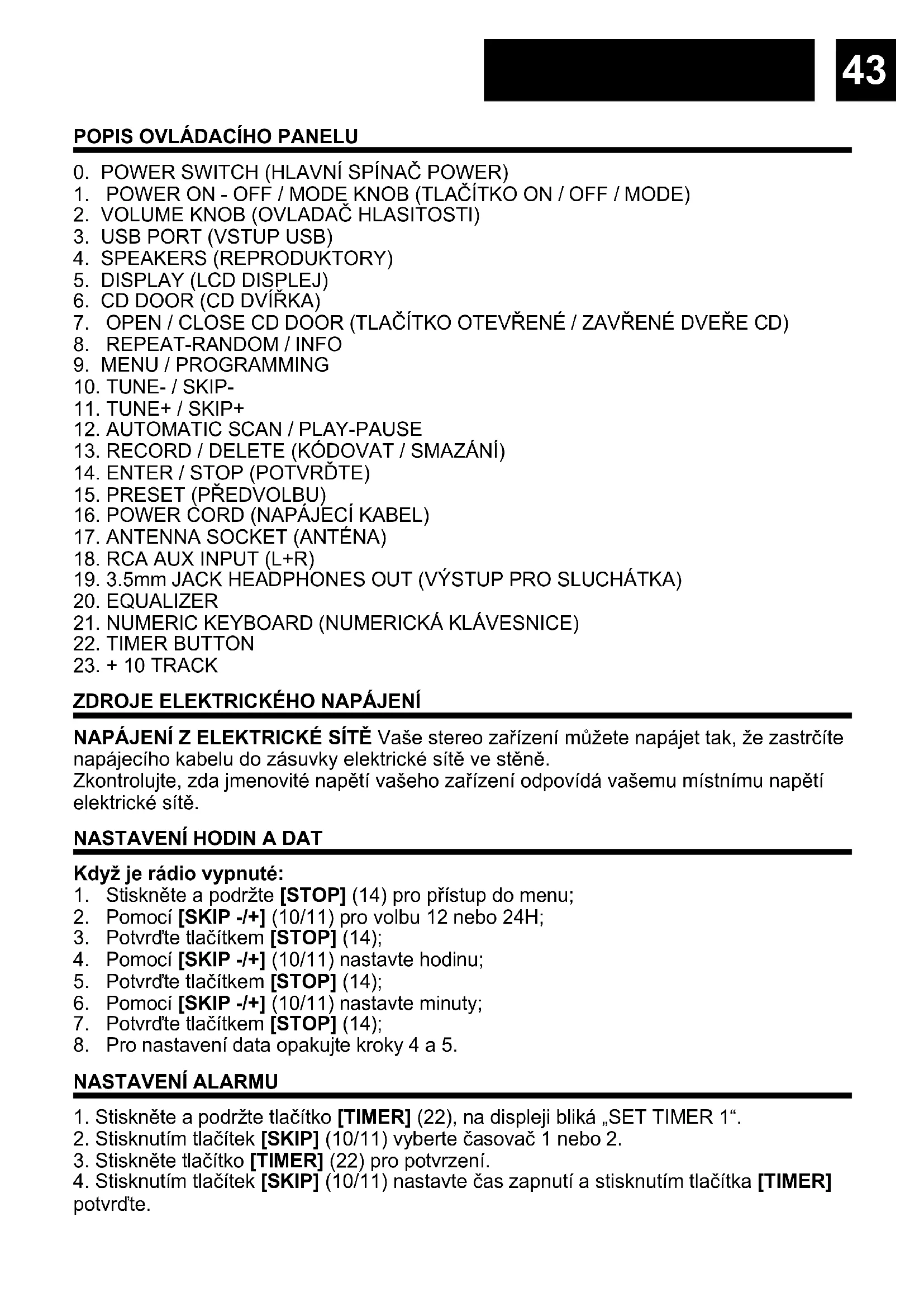 - Random: Skladby jsou přehrávány náhodně. EQUALIZER V libovolném režimu můžete stisknout a podržet tlačítko [EQ] (20) a poté krátkým sti- sknutím tlačítka opakovaně zvolíte mezi FLAT / POP / CLASSIC / ROCK / JAZZ.48 Čeština TECHNICKÉ SPECIFIKACE Napájení: AC 230V ~ 50Hz. Spotřeba energie v pohotovostním režimu: 0.33W Doba pohotovostního režimu 15 min.