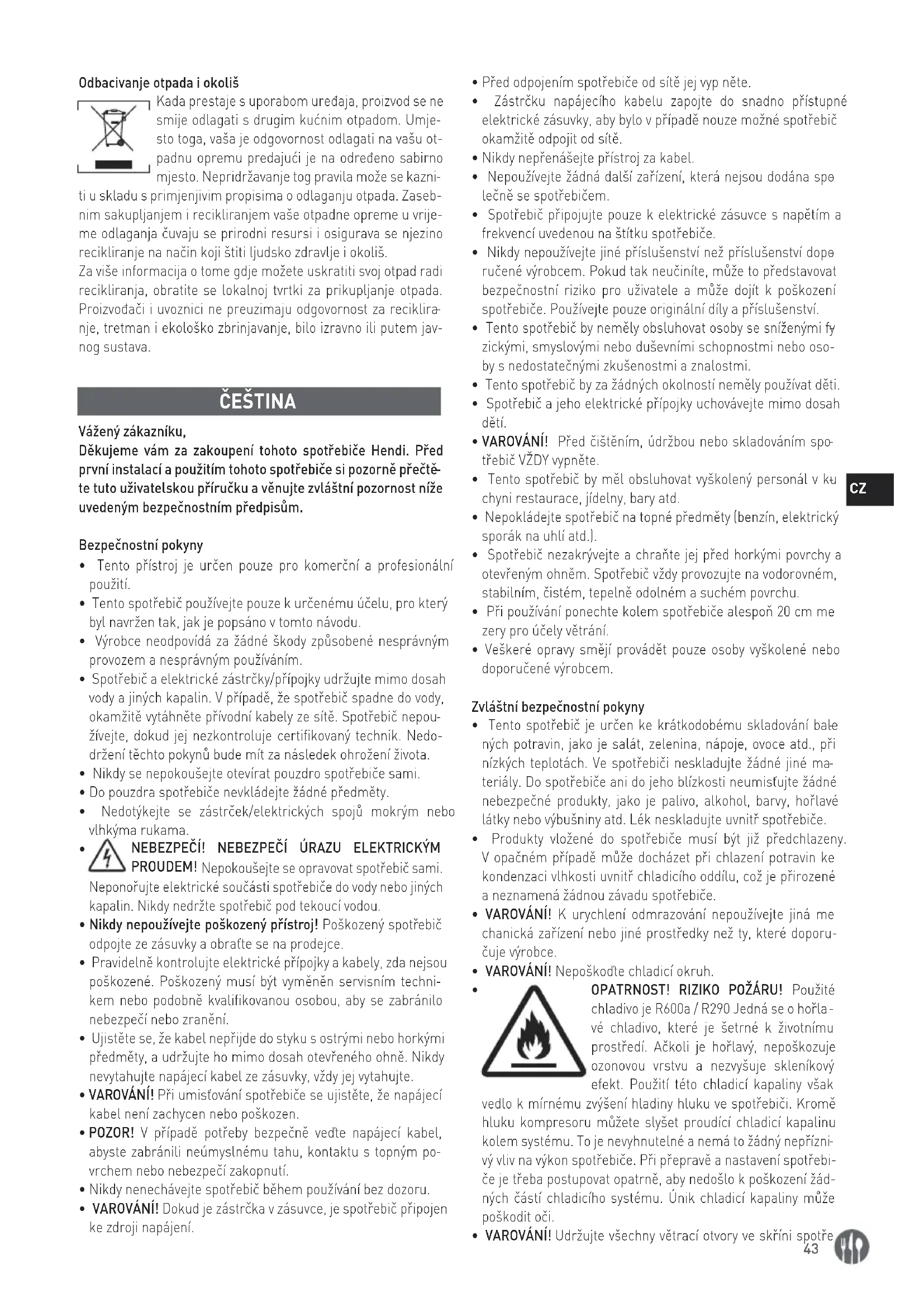 nje, tretman i ekološko zbrinjavanje, bilo izravno ili putem jav- nog sustava. ČEŠTINA Vážený zákazníku, Děkujeme vám za zakoupení tohoto spotřebiče Hendi. Před první instalací a použitím tohoto spotřebiče si pozorně přečtě