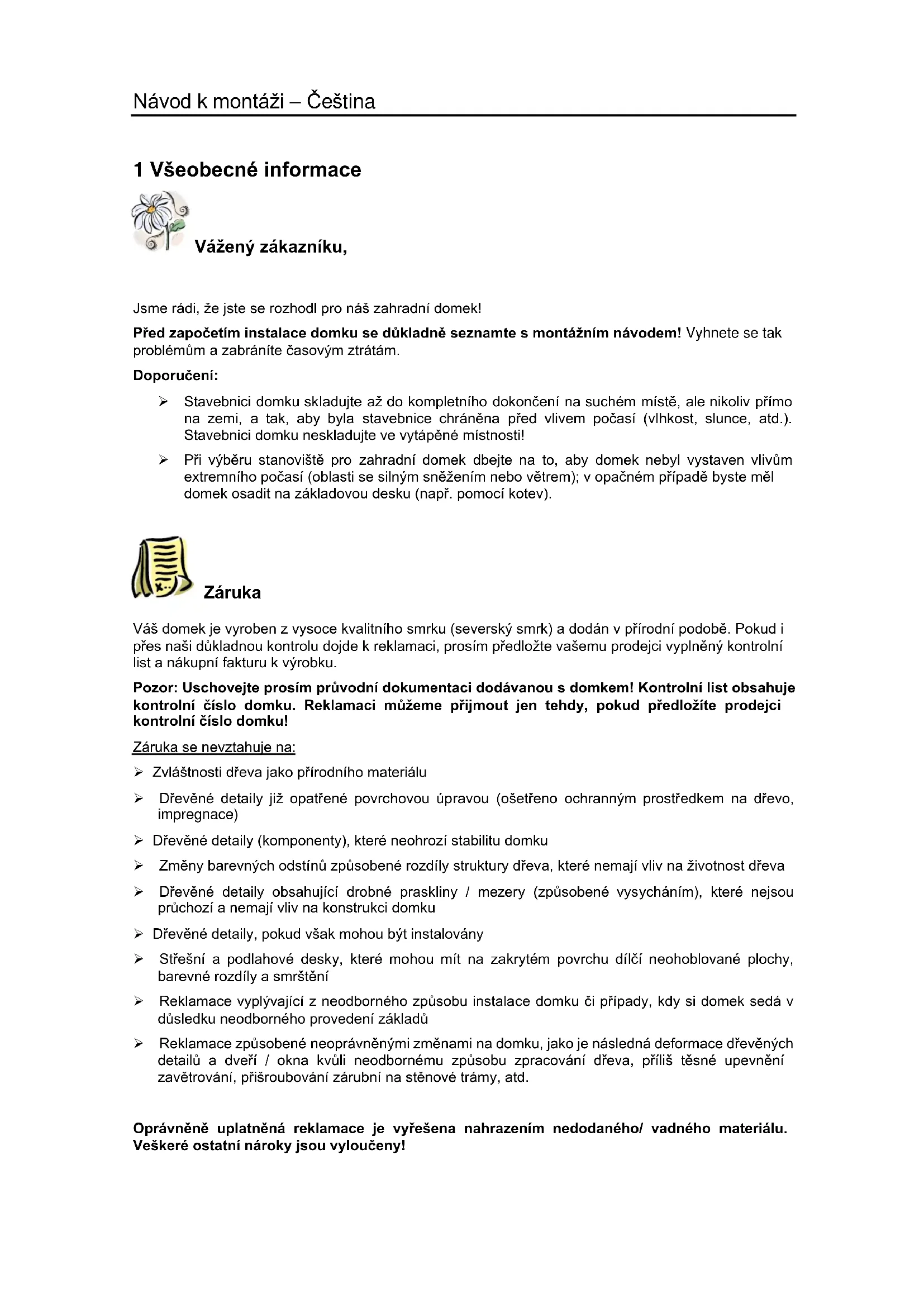 1 Všeobecné informace Vážený zákazníku, Jsme rádi, že jste se rozhodl pro náš zahradní domek! Před započetím instalace domku se důkladně seznamte s montážním návodem! Vyhnete se tak problémům a zabráníte časovým ztrátám. Doporučení: ➢ Stavebnici domku skladujte až do kompletního dokončení na suchém místě, ale nikoliv přímo na zemi, a tak, aby byla stavebnice chráněna před vlivem počasí (vlhkost, slunce, atd.). Stavebnici domku neskladujte ve vytápěné místnosti! ➢ Při výběru stanoviště pro zahradní domek dbejte na to, aby domek nebyl vystaven vlivům extremního počasí (oblasti se silným sněžením nebo větrem); v opačném případě byste měl domek osadit na základovou desku (např. pomocí kotev). Záruka Váš domek je vyroben z vysoce kvalitního smrku (severský smrk) a dodán v přírodní podobě. Pokud i přes naši důkladnou kontrolu dojde k reklamaci, prosím předložte vašemu prodejci vyplněný kontrolní list a nákupní fakturu k výrobku. Pozor: Uschovejte prosím průvodní dokumentaci dodávanou s domkem! Kontrolní list obsahuje kontrolní číslo domku. Reklamaci můžeme přijmout jen tehdy, pokud předložíte prodejci kontrolní číslo domku! Záruka se nevztahuje na: ➢ Zvláštnosti dřeva jako přírodního materiálu ➢ Dřevěné detaily již opatřené povrchovou úpravou (ošetřeno ochranným prostředkem na dřevo, impregnace) ➢ Dřevěné detaily (komponenty), které neohrozí stabilitu domku ➢ Změny barevných odstínů způsobené rozdíly struktury dřeva, které nemají vliv na životnost dřeva ➢ Dřevěné detaily obsahující drobné praskliny / mezery (způsobené vysycháním), které nejsou průchozí a nemají vliv na konstrukci domku ➢ Dřevěné detaily, pokud však mohou být instalovány ➢ Střešní a podlahové desky, které mohou mít na zakrytém povrchu dílčí neohoblované plochy, barevné rozdíly a smrštění ➢ Reklamace vyplývající z neodborného způsobu instalace domku či případy, kdy si domek sedá v důsledku neodborného provedení základů ➢ Reklamace způsobené neoprávněnými změnami na domku, jako je následná deformace dřevěných detailů a dveří / okna kvůli neodbornému způsobu zpracování dřeva, příliš těsné upevnění zavětrování, přišroubování zárubní na stěnové trámy, atd. Oprávněně uplatněná reklamace je vyřešena nahrazením nedodaného/ vadného materiálu. Veškeré ostatní nároky jsou vyloučeny!Návod k montáži – Čeština