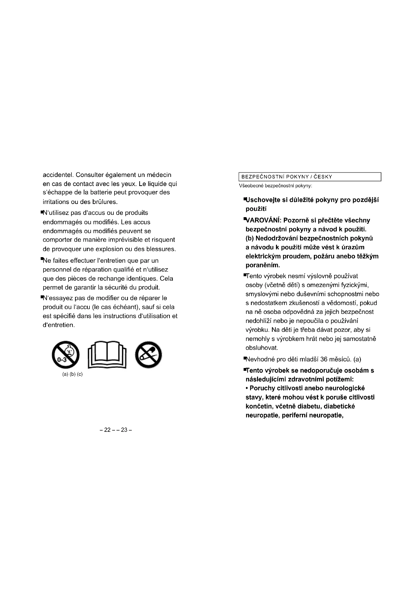 Nepokoušejte se výrobek nebo akumulátor (v případě potřeby) modikovat nebo opravovat, pokud to není uvedeno v návodu k použití a údržbě. (a) (b) (c)– 30 – – 31 – eller kulde (f.eks. mennesker med handicap osv.), bør du tale med din læge, inden du bruger produktet!