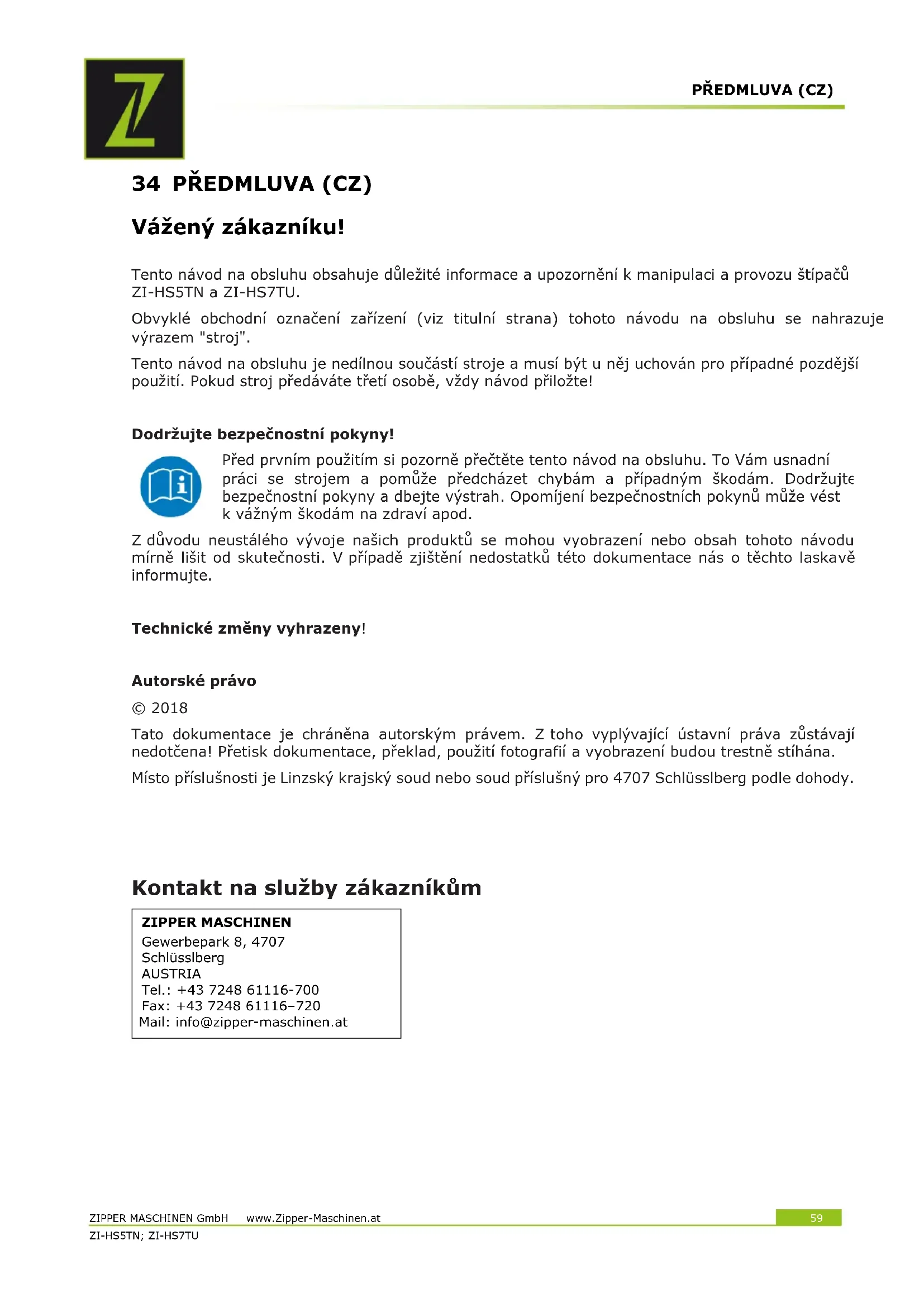Pro prověřeni oprávněnosti reklamace musí kupujíci kontaktovat prodávajíciho; ten nahlasí vzniklou vadupisemné firmeZipper.Prioprávněnosti reklamace bude stroj vyzvednut firmou Zipper u prodávajíciho/distributora.Zaslání nazpět bez prédchozoho souhlasu firmyZipper nebude akceptovánoa zásilka nebude prévizata.