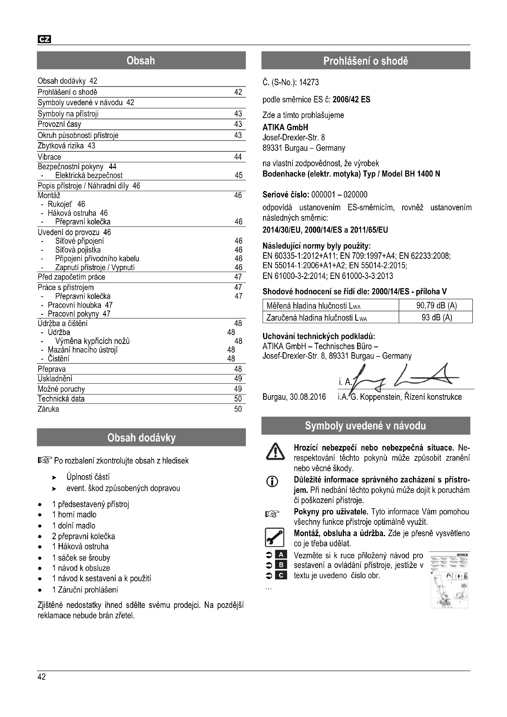 Prohlášení o shodě Č. (S-No.): 14273 podle směrnice ES č: 2006/42 ES Zde a tímto prohlašujeme ATIKA GmbH Josef-Drexler-Str. 8 89331 Burgau – Germany na vlastní zodpovědnost, že výrobek Bodenhacke (elektr. motyka) Typ / Model BH 1400 N Seriové číslo: 000001 – 020000 odpovídá ustanovením ES-směrnicím, rovněž ustanovením následných směrnic: 2014/30/EU, 2000/14/ES a 2011/65/EU Následující normy byly použity: EN 60335-1:2012+A11; EN 709:1997+A4; EN 62233:2008; EN 55014-1:2006+A1+A2; EN 55014-2:2015; EN 61000-3-2:2014; EN 61000-3-3:2013 Shodové hodnocení se řídí dle: 2000/14/ES - příloha V Měřená hladina hlučnosti L