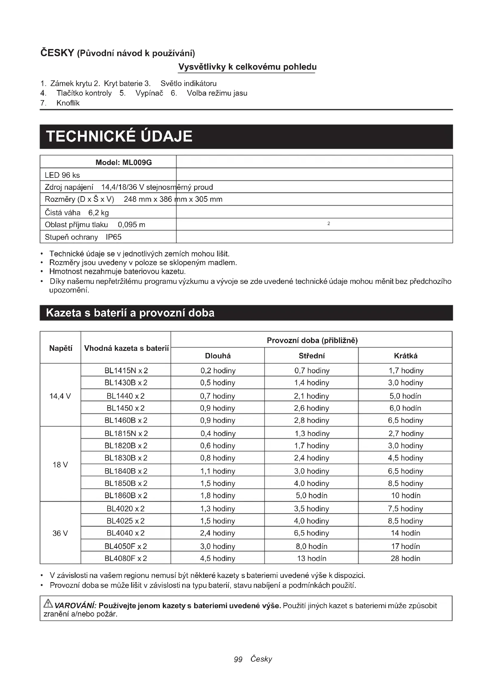 - Díkynašemunepřetržitémuprogramuvýzkumuavývojesezdeuvedenétechnickéúdajemohouměnitbezpředchozího upozornění. Kazeta s baterií a provozní doba Napětí Vhodná kazeta s baterií Provozní doba (přibližně) Dlouhá Střední Krátká 14,4 V BL1415Nx2 0,2hodiny 0,7hodiny 1,7hodiny BL1430Bx2 0,5hodiny 1,4hodiny 3,0hodiny BL1440x2 0,7hodiny 2,1hodiny 5,0hodín BL1450x2 0,9hodiny 2,6hodiny 6,0hodín BL1460Bx2 0,9hodiny 2,8hodiny 6,5hodiny 18 V BL1815Nx2 0,4hodiny 1,3hodiny 2,7hodiny BL1820Bx2 0,6hodiny 1,7hodiny 3,0hodiny BL1830Bx2 0,8hodiny 2,4hodiny 4,5hodiny BL1840Bx2 1,1hodiny 3,0hodiny 6,5hodiny BL1850Bx2 1,5hodiny 4,0hodiny 8,5hodiny BL1860Bx2 1,8hodiny 5,0hodín 10hodín 36 V BL4020x2 1,3hodiny 3,5hodiny 7,5hodiny BL4025x2 1,5hodiny 4,0hodiny 8,5hodiny BL4040x2 2,4hodiny 6,5hodiny 14hodín BL4050Fx2 3,0hodiny 8,0hodín 17hodín BL4080Fx2 4,5hodiny 13hodín 28hodín