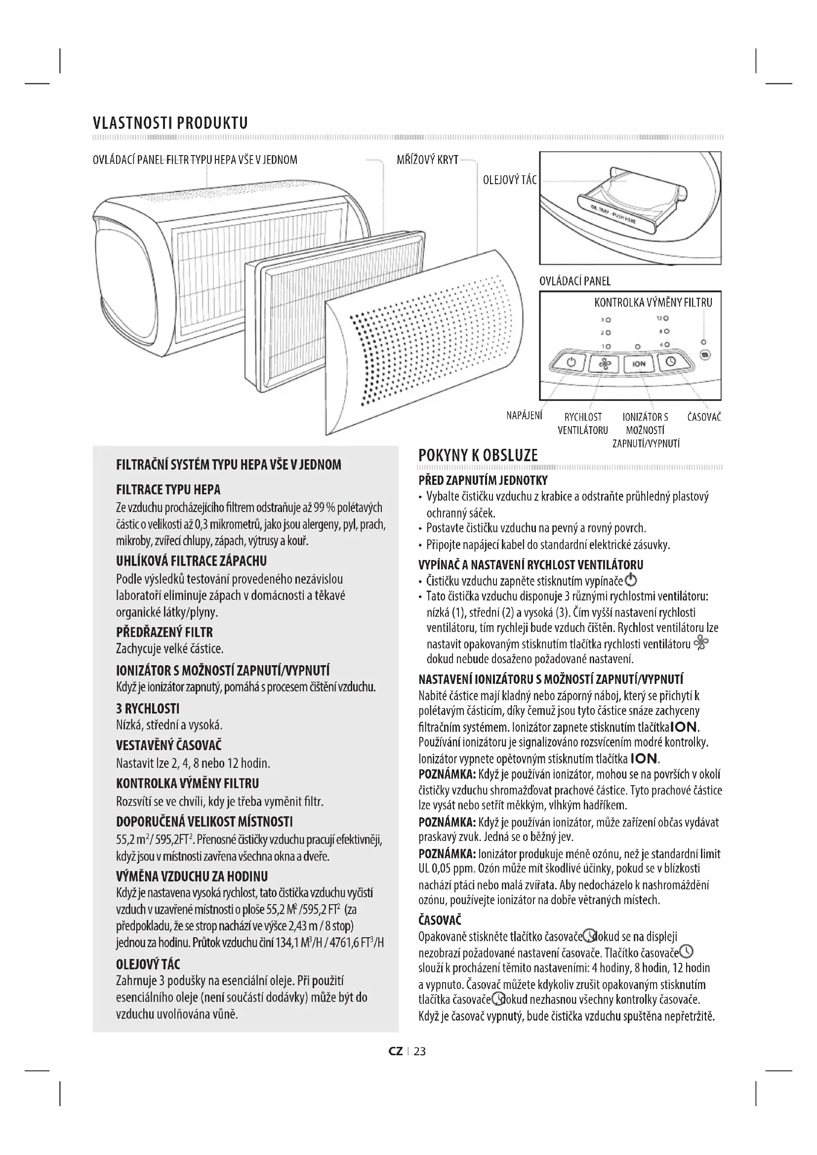 - Tato čistička vzduchu disponuje 3 různými rychlostmi ventilátoru: nízká (1), střední (2) a vysoká (3). Čím vyšší nastavení rychlosti ventilátoru, tím rychleji bude vzduch čištěn. Rychlost ventilátoru lze nastavit opakovaným stisknutím tlačítka rychlosti ventilátoru , dokud nebude dosaženo požadované nastavení. NASTAVENÍ IONIZÁTORU S MOŽNOSTÍ ZAPNUTÍ/VYPNUTÍ Nabité částice mají kladný nebo záporný náboj, který se přichytí k polétavým částicím, díky čemuž jsou tyto částice snáze zachyceny ltračním systémem. Ionizátor zapnete stisknutím tlačítkaION. Používání ionizátoru je signalizováno rozsvícením modré kontrolky. Ionizátor vypnete opětovným stisknutím tlačítka ION. POZNÁMKA: Když je používán ionizátor, mohou se na površích v okolí čističky vzduchu shromažďovat prachové částice. Tyto prachové částice lze vysát nebo setřít měkkým, vlhkým hadříkem. POZNÁMKA: Když je používán ionizátor, může zařízení občas vydávat praskavý zvuk. Jedná se o běžný jev. POZNÁMKA: Ionizátor produkuje méně ozónu, než je standardní limit UL 0,05 ppm. Ozón může mít škodlivé účinky, pokud se v blízkosti nachází ptáci nebo malá zvířata. Aby nedocházelo k nashromáždění ozónu, používejte ionizátor na dobře větraných místech. ČASOVAČ Opakovaně stiskněte tlačítko časovače , dokud se na displeji nezobrazí požadované nastavení časovače. Tlačítko časovače slouží k procházení těmito nastaveními: 4 hodiny, 8 hodin, 12 hodin a vypnuto. Časovač můžete kdykoliv zrušit opakovaným stisknutím tlačítka časovače , dokud nezhasnou všechny kontrolky časovače. Když je časovač vypnutý, bude čistička vzduchu spuštěna nepřetržitě. FILTRAČNÍ SYSTÉM TYPU HEPA VŠE V JEDNOM