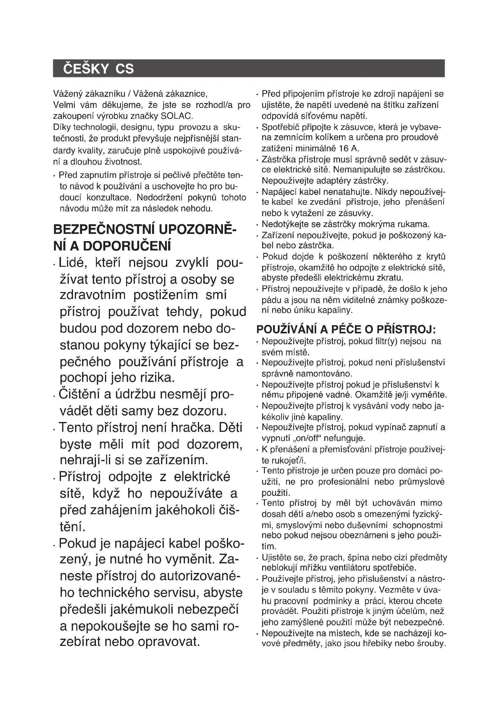- Tento přístroje je určen pouze pro domácí po- užití, ne pro profesionální nebo průmyslové použití.