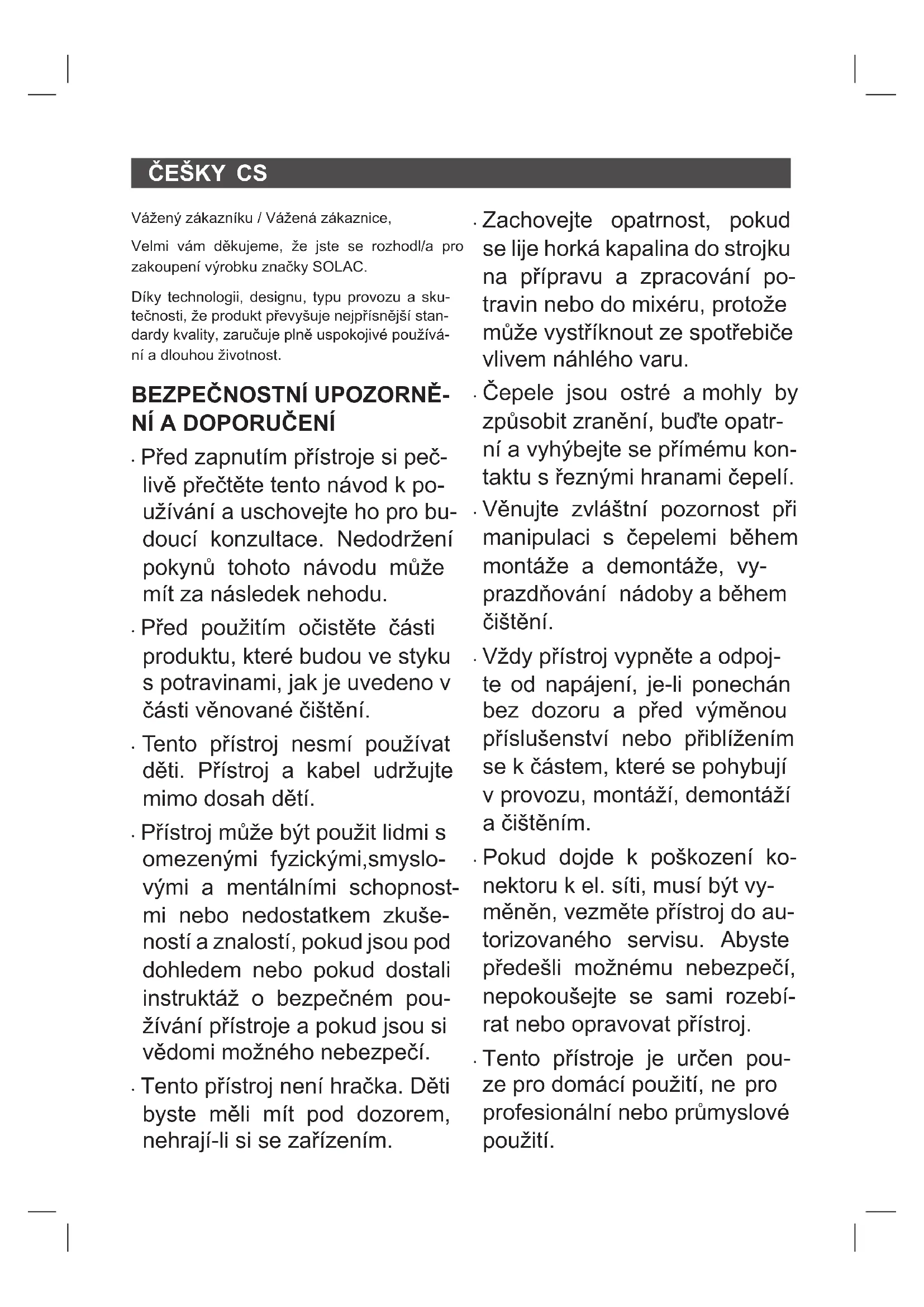 Vážený zákazníku / Vážená zákaznice, Velmi vám děkujeme, že jste se rozhodl/a pro zakoupení výrobku značky SOLAC. Díky technologii, designu, typu provozu a sku- tečnosti, že produkt převyšuje nejpřísnější stan- dardy kvality, zaručuje plně uspokojivé používá- ní a dlouhou životnost.