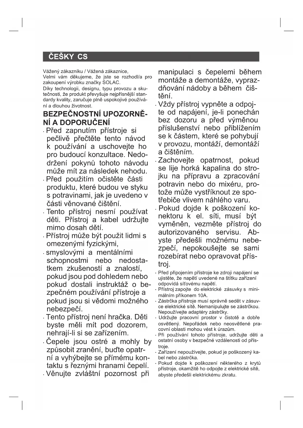 - Produkt neobsahuje koncentrace látek, které by mohly být považovány za škodlivé pro ži- votní prostředí. Tento symbol znamená, že po skončení životnosti přístroje je třeba tento zanést na autorizované místo pro oddělený sběr a recyklaci odpadních elektrických a elek- tronických zařízení (OEEZ). Tento přístroj je v souladu se směrnicí 2014/35/ EU o nízkém napětí, směrnicí 2014/30/EU o ele- ktromagnetické kompatibilitě, směrnicí 2011/65/ EU o omezení používání některých nebe- zpečných látek v elektrických a elektronických zařízeních a směrnicí 2009/125/ES o požadav- cích na ekodesign výrobků spojených se spotře- bou energieCS Recept Doporučené příslušenství Rychlost Množství Doba přípravy Majonéza Tyčový mixér 4 250 ml 1 vejce dejte do misky se špetkou soli a několi- ka kapkami octa nebo citrónu. Přidejte olej do určené úrovně. Zapněte spotřebič a nehýbejte s ním, dokud se olej pořád- ně nesmíchá. 30 vteřin Bešamelová omáčka Tyčový mixér 3 600 ml Rozpusťte 30g másla v pánvi na mírném ohni. Přidejte 100g mouky a 30g smažené cibule (již nakrá- jené kráječem). Pomalu přidávejte 500ml mléka. 20 vteřin Bramborová kaše Tyčový mixér MAX 400 g Brambory můžete rozmačkat, když mixér zapnete přímo v hrnci. 30 vteřin Dětská výživa: ovoce a drcené sušenky Tyčový mixér MAX 300 g Nakrájejte a vložte 100g jablka, 100g banánu, 50g sušenek a šťávu z jedno- ho pomeranče do nádoby 25 vteřin Mletí masa Tyčový mixér TURBO 40 g Maso nakrájejte na poža- dovanou strukturu. 10 vteřin Strouhanka Sekač MAX 80 g (1~2cm) Rozřezejte tvrdý chléb před tím než ho vložíte do nádoby. Mixujte až do dosažení požadované struktury. 50 vteřin Strouhaný sýr Sekač MAX 100 g (1~2cm) Sýr nakrájejte na kostičky o 1 cm a mixujte až do dosažení požadované konzistence. 30 vteřin Mleté arašídy Sekač MAX 100 g Odstraňte slupky a mixu- jte, dokud není dosaženo požadované konzistence 20 vteřin Mletí masa Sekač MAX 250 g (1~2cm) Nejdříve nakrájíme na kousky o 1 cm, meleme dokud není dosaženo požadované konzistence 10 vteřinPOLSKI PL Szanowny Kliencie, Serdecznie dziękujemy za zdecydowanie się na zakup sprzętu gospodarstwa domowego marki SOLAC. Jego technologia, forma i funkcjonalność, jak również fakt, że spełnia on wszelkie normy jakości, dostarczy Państwu pełnej satysfakcji przez długi czas.