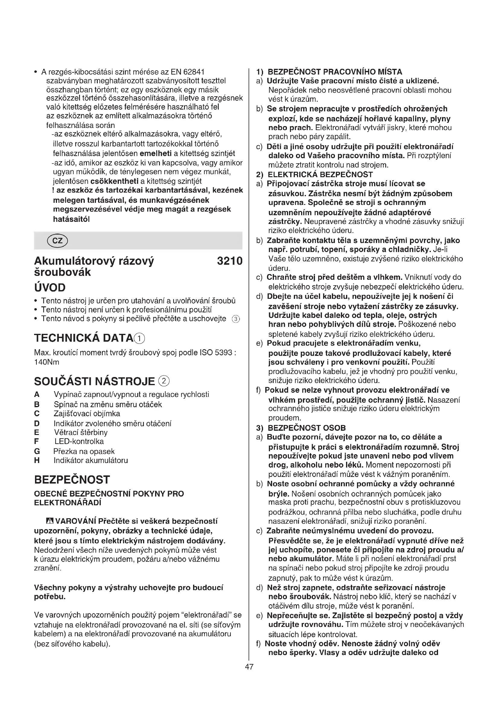ELEKTRONÁŘADÍ - VAROVÁNÍ Přečtěte si veškerá bezpečností upozornění, pokyny, obrázky a technické údaje, které jsou s tímto elektrickým nástrojem dodávány. Nedodržení všech níže uvedených pokynů může vést k úrazu elektrickým proudem, požáru a/nebo vážnému zranění. Všechny pokyny a výstrahy uchovejte pro budoucí potřebu. Ve varovných upozorněních použitý pojem “elektronářadí” se vztahuje na elektronářadí provozované na el. síti (se síťovým kabelem) a na elektronářadí provozované na akumulátoru (bez síťového kabelu).48 vnikne do očí, navštivte navíc i lékaře. Vytékající akumulátorová kapalina může způsobit podráždění pokožky nebo popáleniny. e) Nepoužívejte akumulátor nebo nářadí, které jsou poškozené nebo upravené. Poškozené nebo upravené akumulátory se mohou chovat nepředvídaně a způsobit požár, výbuch nebo poranění. f) Nevystavujte akumulátor nebo nářadí ohni nebo nadměrné teplotě. Vystavení ohni nebo teplotě nad 130°C může způsobit výbuch. g) Dodržujte všechny pokyny pro nabíjení a nenabíjejte akumulátor nebo nářadí mimo teplotní rozsah uvedený v pokynech. Nesprávné nabíjení nebo nabíjení při teplotách mimo uvedený rozsah může poškodit akumulátor a zvýšit riziko požáru.