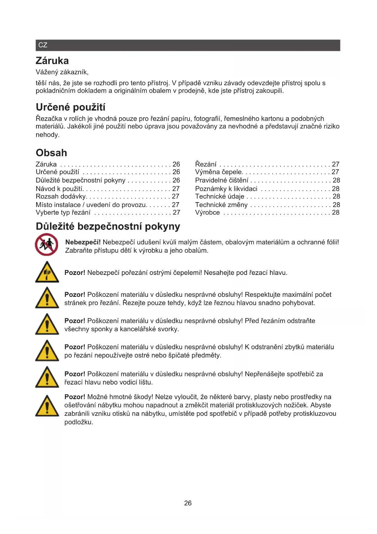- Záruka Vážený zákazník, těší nás, že jste se rozhodli pro tento přístroj. V případě vzniku závady odevzdejte přístroj spolu s pokladničním dokladem a originálním obalem v prodejně, kde jste přístroj zakoupili. Určené použití Řezačka v rolích je vhodná pouze pro řezání papíru, fotograí, řemeslného kartonu a podobných materiálů. Jakékoli jiné použití nebo úprava jsou považovány za nevhodné a představují značné riziko nehody. Obsah Záruka p. 26