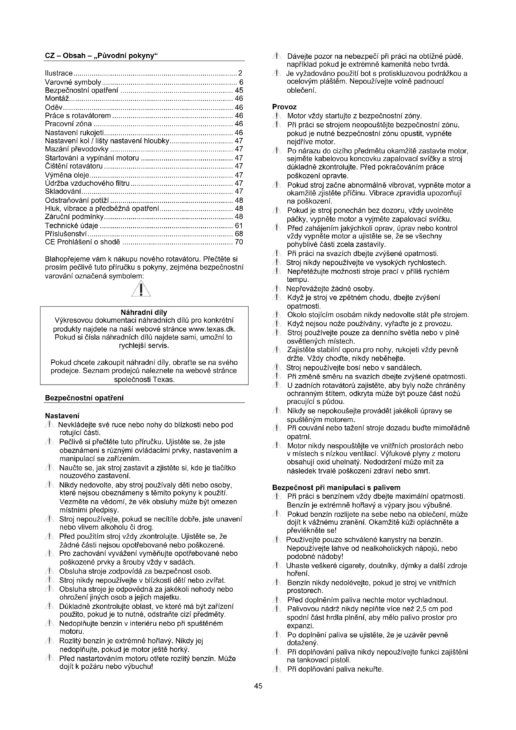 Náhradní díly Výkresovou dokumentaci náhradních dílů pro konkrétní produkty najdete na naší webové stránce www.texas.dk. Pokud si čísla náhradních dílů najdete sami, umožní to rychlejší servis. Pokud chcete zakoupit náhradní díly, obraťte se na svého prodejce. Seznam prodejců naleznete na webové stránce společnosti Texas. Bezpečnostní opatření Nastavení Nevkládejte své ruce nebo nohy do blízkosti nebo pod rotující části. Pečlivě si přečtěte tuto příručku. Ujistěte se, že jste obeznámeni s různými ovládacími prvky, nastavením a manipulací se zařízením. Naučte se, jak stroj zastavit a zjistěte si, kde je tlačítko nouzového zastavení. Nikdy nedovolte, aby stroj používaly děti nebo osoby, které nejsou obeznámeny s těmito pokyny k použití. Vezměte na vědomí, že věk obsluhy může být omezen místními předpisy. Stroj nepoužívejte, pokud se necítíte dobře, jste unavení nebo vlivem alkoholu či drog. Před použitím stroj vždy zkontrolujte. Ujistěte se, že žádné části nejsou opotřebované nebo poškozené. Pro zachování vyvážení vyměňujte opotřebované nebo poškozené prvky a šrouby vždy v sadách. Obsluha stroje zodpovídá za bezpečnost osob. Stroj nikdy nepoužívejte v blízkosti dětí nebo zvířat. Obsluha stroje je odpovědná za jakékoli nehody nebo ohrožení jiných osob a jejich majetku. Důkladně zkontrolujte oblast, ve které má být zařízení použito, pokud je to nutné, odstraňte cizí předměty. Nedoplňujte benzín v interiéru nebo při spuštěném motoru. Rozlitý benzín je extrémně hořlavý. Nikdy jej nedoplňujte, pokud je motor ještě horký. Před nastartováním motoru otřete rozlitý benzín. Může dojít k požáru nebo výbuchu! Dávejte pozor na nebezpečí při práci na obtížné půdě, například pokud je extrémně kamenitá nebo tvrdá. Je vyžadováno použití bot s protiskluzovou podrážkou a ocelovým pláštěm. Nepoužívejte volně padnoucí oblečení. Provoz Motor vždy startujte z bezpečnostní zóny. Při práci se strojem neopouštějte bezpečnostní zónu, pokud je nutné bezpečnostní zónu opustit, vypněte nejdříve motor. Po nárazu do cizího předmětu okamžitě zastavte motor, sejměte kabelovou koncovku zapalovací svíčky a stroj důkladně zkontrolujte. Před pokračováním práce poškození opravte. Pokud stroj začne abnormálně vibrovat, vypněte motor a okamžitě zjistěte příčinu. Vibrace zpravidla upozorňují na poškození. Pokud je stroj ponechán bez dozoru, vždy uvolněte páčky, vypněte motor a vyjměte zapalovací svíčku. Před zahájením jakýchkoli oprav, úprav nebo kontrol vždy vypněte motor a ujistěte se, že se všechny pohyblivé části zcela zastavily. Při práci na svazích dbejte zvýšené opatrnosti. Stroj nikdy nepoužívejte ve vysokých rychlostech. Nepřetěžujte možnosti stroje prací v příliš rychlém tempu. Nepřevážejte žádné osoby. Když je stroj ve zpětném chodu, dbejte zvýšení opatrnosti. Okolo stojícím osobám nikdy nedovolte stát pře strojem. Když nejsou nože používány, vyřaďte je z provozu. Stroj používejte pouze za denního světla nebo v plně osvětlených místech. Zajistěte stabilní oporu pro nohy, rukojeti vždy pevně držte. Vždy choďte, nikdy neběhejte. Stroj nepoužívejte bosí nebo v sandálech. Při změně směru na svazích dbejte zvýšené opatrnosti. U zadních rotavátorů zajistěte, aby byly nože chráněny ochranným štítem, odkryta může být pouze část nožů pracující s půdou. Nikdy se nepokoušejte provádět jakékoli úpravy se spuštěným motorem. Při couvání nebo tažení stroje dozadu buďte mimořádně opatrní. Motor nikdy nespouštějte ve vnitřních prostorách nebo v místech s nízkou ventilací. Výfukové plyny z motoru obsahují oxid uhelnatý. Nedodržení může mít za následek trvalé poškození zdraví nebo smrt. Bezpečnost při manipulaci s palivem Při práci s benzínem vždy dbejte maximální opatrnosti. Benzín je extrémně hořlavý a výpary jsou výbušné. Pokud benzín rozlijete na sebe nebo na oblečení, může dojít k vážnému zranění. Okamžitě kůži opláchněte a převlékněte se! Používejte pouze schválené kanystry na benzín. Nepoužívejte lahve od nealkoholických nápojů, nebo podobné nádoby! Uhaste veškeré cigarety, doutníky, dýmky a další zdroje hoření. Benzín nikdy nedolévejte, pokud je stroj ve vnitřních prostorech. Před doplněním paliva nechte motor vychladnout. Palivovou nádrž nikdy neplňte více než 2,5 cm pod spodní část hrdla plnění, aby mělo palivo prostor pro expanzi. Po doplnění paliva se ujistěte, že je uzávěr pevně dotažený. Při doplňování paliva nikdy nepoužívejte funkci zajištění na tankovací pistoli. Při doplňování paliva nekuřte.46