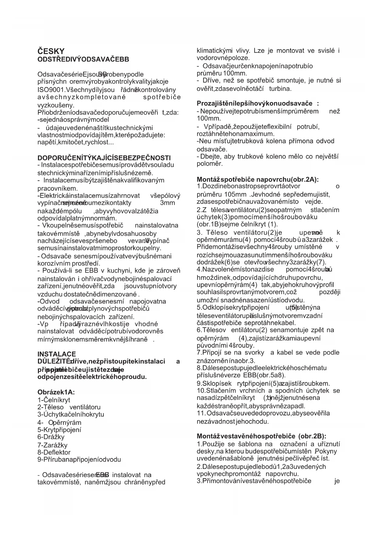 Tento spotřebič nesmí používat děti mladší 8 let a osoby se sníženými fyzickými, senzorickými či mentálními schopnostmi nebo osoby s nedostatečnou zkušeností a znalostmi, pokud nejsou pod dozorem zodpovědné osoby nebo pokud jim taková osoba nedala dostatečné instrukce, které zajistí bezpečné užívání spotřebiče a pochopení rizik s tím spojených. Uživatel musí zajistit, aby si se spotřebičem nehrály děti. Čištění a údržba spotřebiče nesmí být prováděna dětmi bez dozoru.РУССКИЙ ЦЕНТРОБЕЖНЫЙ ВЫТЯЖНОЙ ВЕНТИЛЯТОРEBB РЕКОМЕНДАЦИИ ПО МЕРАМ БЕЗОПАСНОСТИ