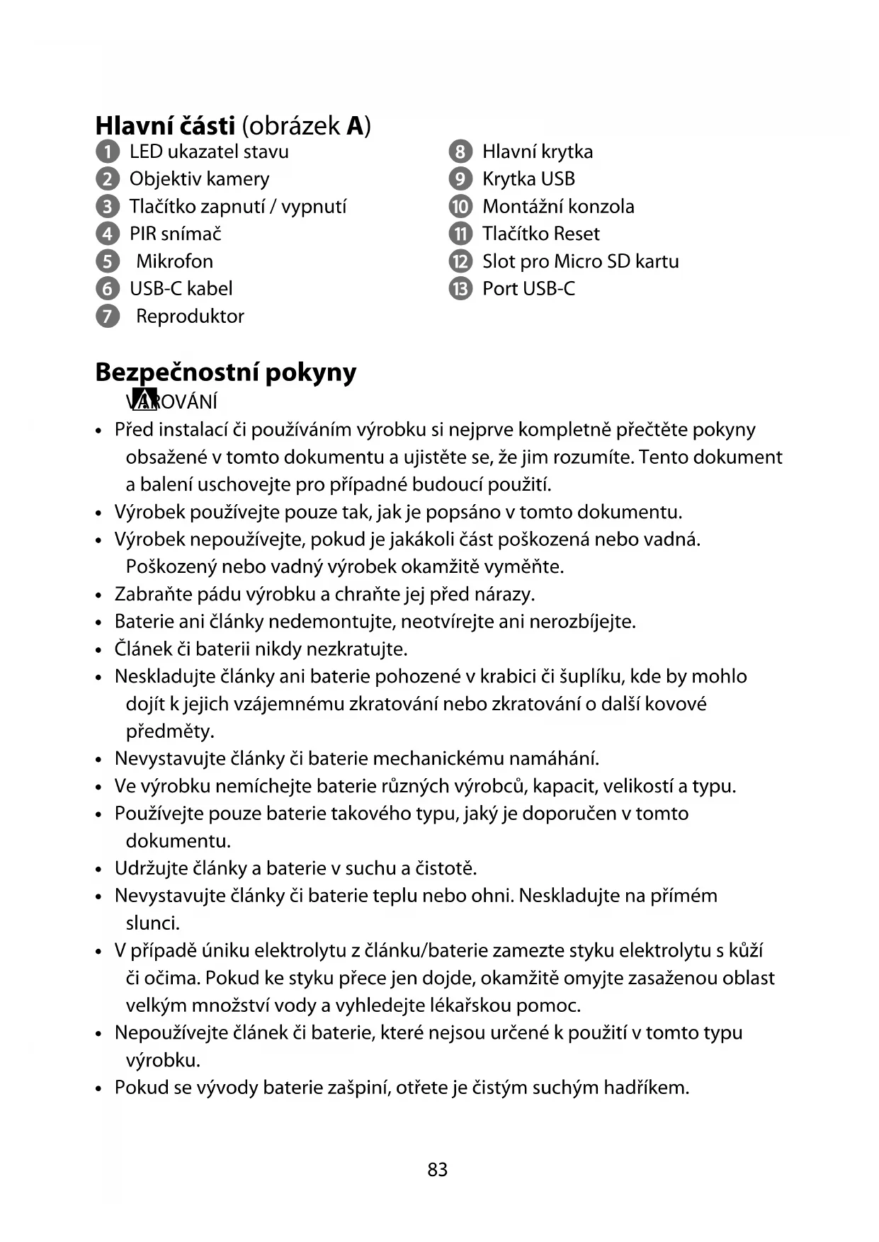 Rychlý návod Wi-Fi kamera na baterii WIFICBO30WT Více informací najdete v rozšířené příručce online: ned.is/wicbo30wt Zamýšlené použití Výrobek je určen kpoužití jako bezpečnostní IP kamera ve vnitřních ivenkovních prostorách. Před instalací apoužitím bezpečnostních kamer si vždy projděte místní zákony apředpisy, které následně musí být dodrženy. Výrobek není určen k profesionálnímu použití. Jakékoli úpravy výrobku mohou ovlivnit jeho bezpečnost, záruku a správné fungování.83 Hlavní části (obrázek A) 1 LED ukazatel stavu 2 Objektiv kamery 3 Tlačítko zapnutí / vypnutí 4 PIR snímač 5 Mikrofon 6 USB-C kabel 7 Reproduktor 8 Hlavní krytka 9 Krytka USB q Montážní konzola w Tlačítko Reset e Slot pro Micro SD kartu r Port USB-C Bezpečnostní pokyny