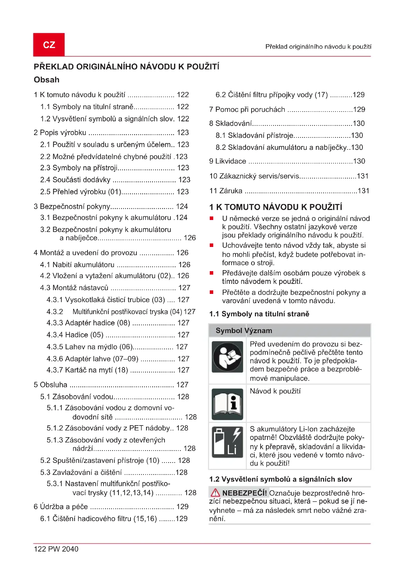 Opotřebované díly, které jsou na kartě náhradních dílů xxxxxx (x) označeny rámečkem. Záruční doba začíná dnem nákupu prvním koncovým uživatelem. Rozhodující je datum na nákupním dokladu. Stímto záručním listem a originálem nákupního dokladu se obraťte na svého prodejce nebo nejbližší autorizovaný servis pro zákazníky. Zákonné nároky kupujícího na reklamaci nedostatků vůči prodávajícímu zůstávají tímto prohlášením nedotčeny.SK 132 PW 2040 Preklad originálneho návodu na použitie PREKLAD ORIGINÁLNEHO NÁVODU NA POUŽITIE Obsah 1 O tomto návode na použitie..................... 132