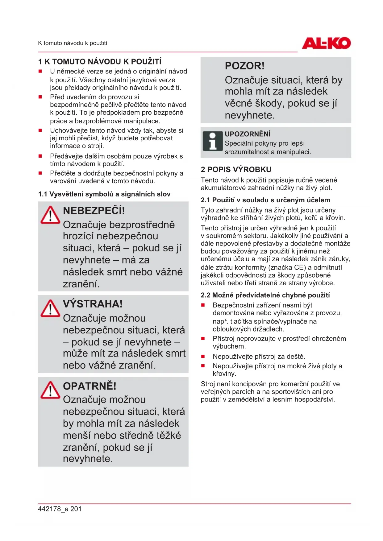 Zuby na noži. Obraťte se na servis AL-KO. Větve nejsou čistě ostříhané. Větve se často sevřou v noži. Nůž je tupý. Obraťte se na servis AL-KO. Kluzná vůle nože je příliš velká. Obraťte se na servis AL-KO. Motor běží, ale nůž se nepohybuje. Chyba stroje Obraťte se na servis AL-KO. Stroj nezvykle vibruje. Chyba stroje Obraťte se na servis AL-KO. Provozní doba s akumulátorem se podstatně zkracuje. Životnost akumulátoru skončila. Vyměňte akumulátor. Používejte pouze originální příslušenství od výrobce. Akumulátor není možné nabít. Kontakty akumulátoru jsou znečištěné. Obraťte se na servis AL-KO. Akumulátor nebo nabíječka vykazují vadu. Objednání náhradních dílů. Obraťte se na servis AL-KO. Akumulátor je příliš horký. Nechte akumulátor vychladnout.442178_a 221 Záruka UPOZORNĚNÍ V případě poruch, které nejsou v této tabulce uvedené nebo které nemůžete sami odstranit, se obraťte na náš zákaznický servis. 14 ZÁRUKA Případné vady na materiálu či výrobní závady na výrobku odstraníme během zákonné lhůty pro reklamaci nedostatků, a to dle našeho uvážení buď opravou, nebo dodáním náhradního výrobku. Lhůta pro reklamaci nedostatků se řídí právními ustanoveními země, ve které byl výrobek zakoupen. Naše záruka platí jen vnásledujících případech: