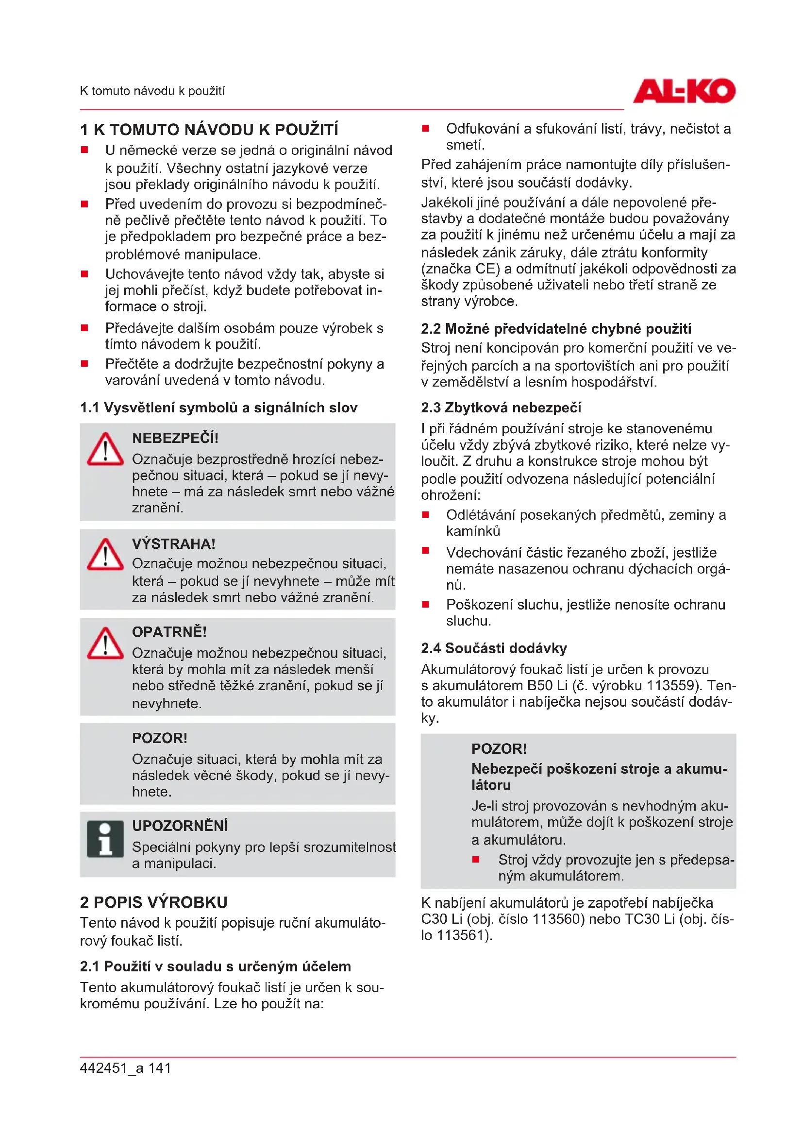 Akumulátorový foukač listí je určen k provozu sakumulátorem B50 Li (č. výrobku 113559). Ten- to akumulátor i nabíječka nejsou součástí dodáv- ky. POZOR! Nebezpečí poškození stroje a akumu- látoru Je-li stroj provozován s nevhodným aku- mulátorem, může dojít k poškození stroje a akumulátoru.