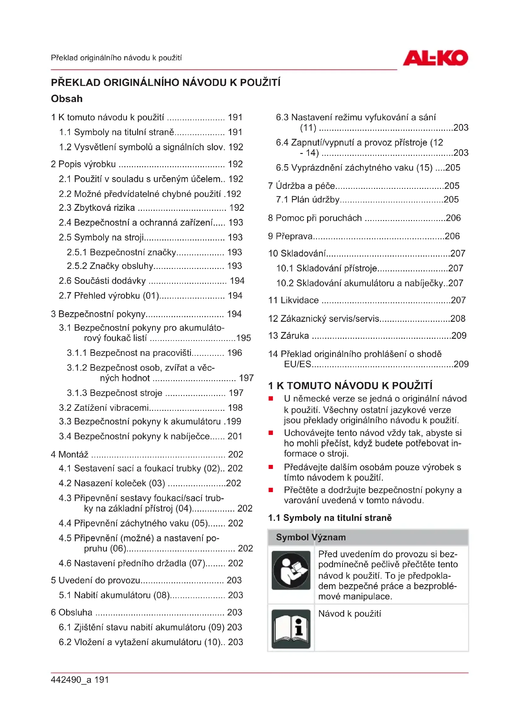 Máte-li nějaké dotazy k záruce, opravě nebo ná- hradním dílům, obraťte se prosím na nejbližší servisAL-KO. Najdete je na internetu pod násle- dující adresou: www.al-ko.com/service-contacts442490_a 209 Záruka 13 ZÁRUKA Případné vady na materiálu či výrobní závady na výrobku odstraníme během zákonné lhůty pro rekla- maci nedostatků, a to dle našeho uvážení buď opravou, nebo dodáním náhradního výrobku. Lhůta pro reklamaci nedostatků se řídí právními ustanoveními země, ve které byl výrobek zakoupen. Naše záruka platí jen vnásledujících případech: