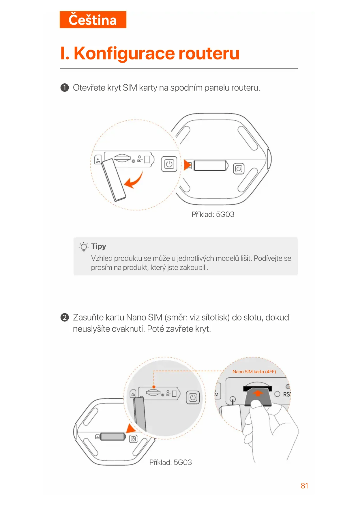 Zasuňte kartu Nano SlM (směr: viz sítotisk) do slotu, dokud neuslyšíte cvaknutí. Poté zavřete kryt. SIM SIM RST Příklad: 5G03 SIM SIM RST SIM RST Nano SIM karta (4FF) Příklad: 5G0382 Tipy Vzhled produktu se může u jednotlivých modelů lišit. Podívejte se prosím na produkt, který jste zakoupili. Chcete-li zajistit výkon a zabránit poškození SIM karty, nevkládejte ani nevyjímejte SIM kartu, když je router spuštěný. Chcete-li SIM kartu vyjmout, jemně na ni zatlačte, dokud nezaklapne. SIM karta se automaticky vysune.