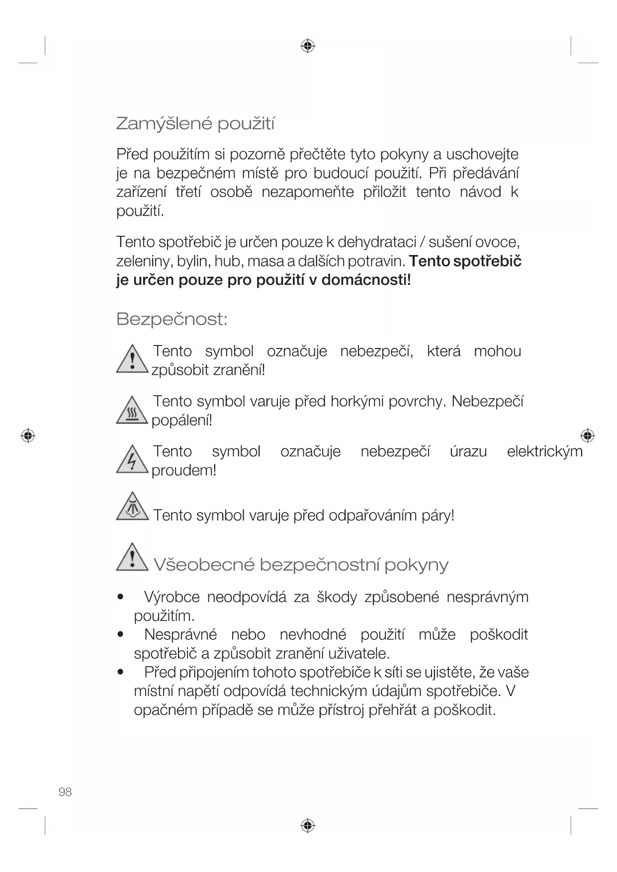- Spotřebič používejte pouze k zamýšlenému účelu a tak, jak je popsáno v této příručce, např. sušení ovoce, zeleniny a jiných potravin. Umístěte spotřebič na rovný a tepelně odolný povrch.