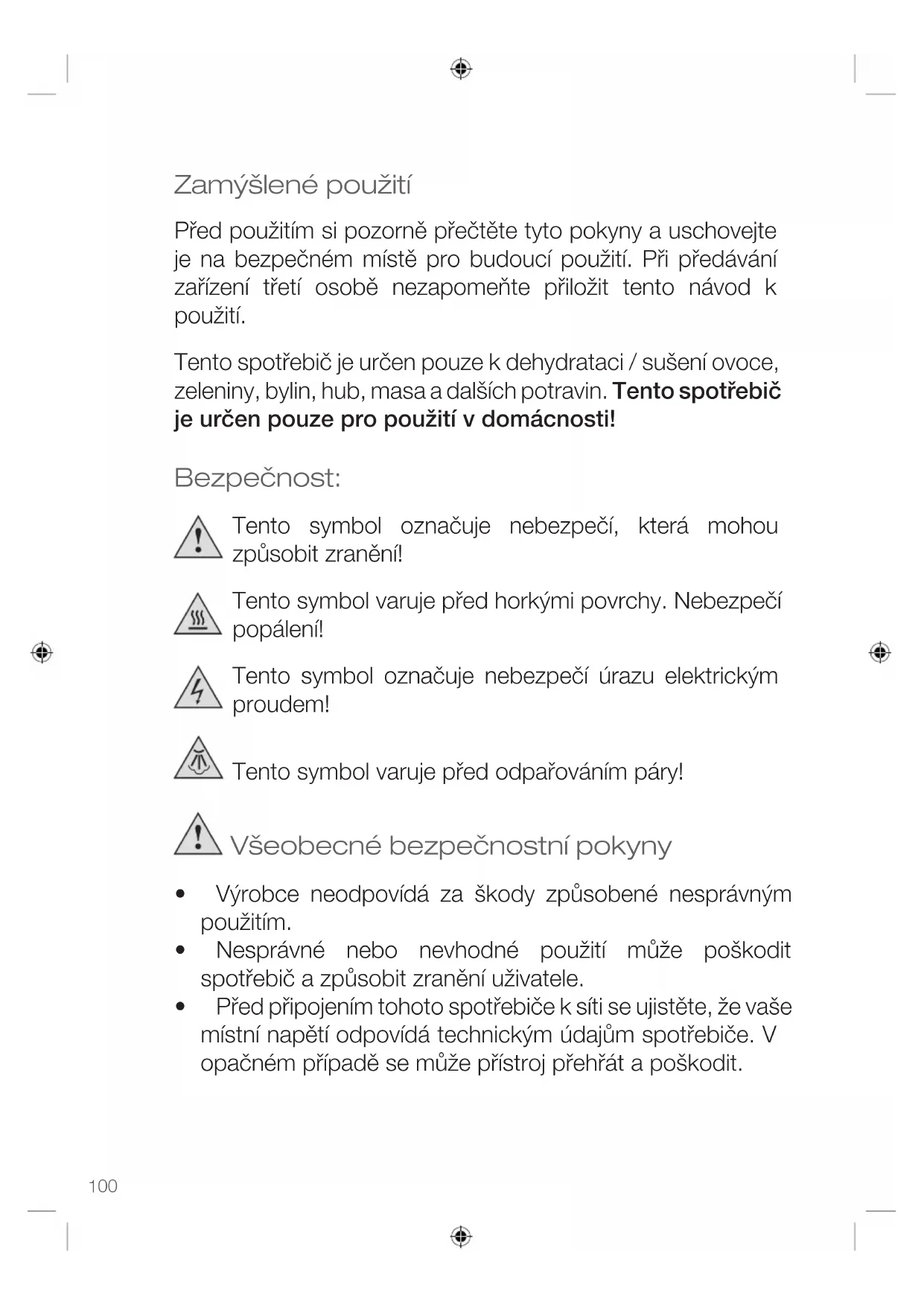 - Spotbrebić používejte pouze k zamyslenému učelu a tak, jak je popsano v teto priruce, napr. sušeni ovoce, zeleniny a jinych potravin. Umistěte spotbrebić na rovná a tepelně odolný povrch.