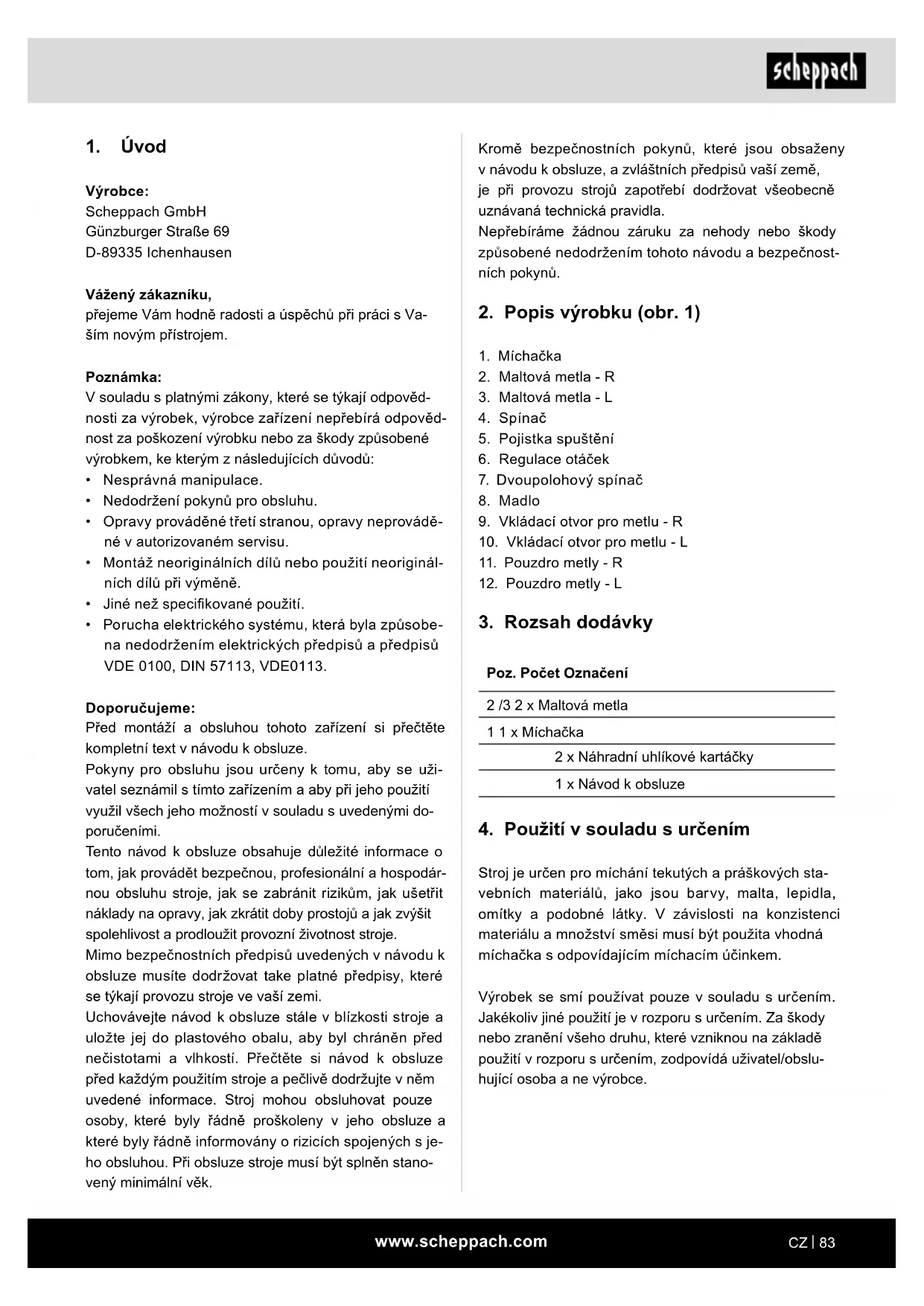 Stroj je určen pro míchání tekutých a práškových sta- vebních materiálů, jako jsou barvy, malta, lepidla, omítky a podobné látky. V závislosti na konzistenci materiálu a množství směsi musí být použita vhodná míchačka s odpovídajícím míchacím účinkem. Výrobek se smí používat pouze v souladu s určením. Jakékoliv jiné použití je v rozporu s určením. Za škody nebo zranění všeho druhu, které vzniknou na základě použití v rozporu s určením, zodpovídá uživatel/obslu- hující osoba a ne výrobce.
