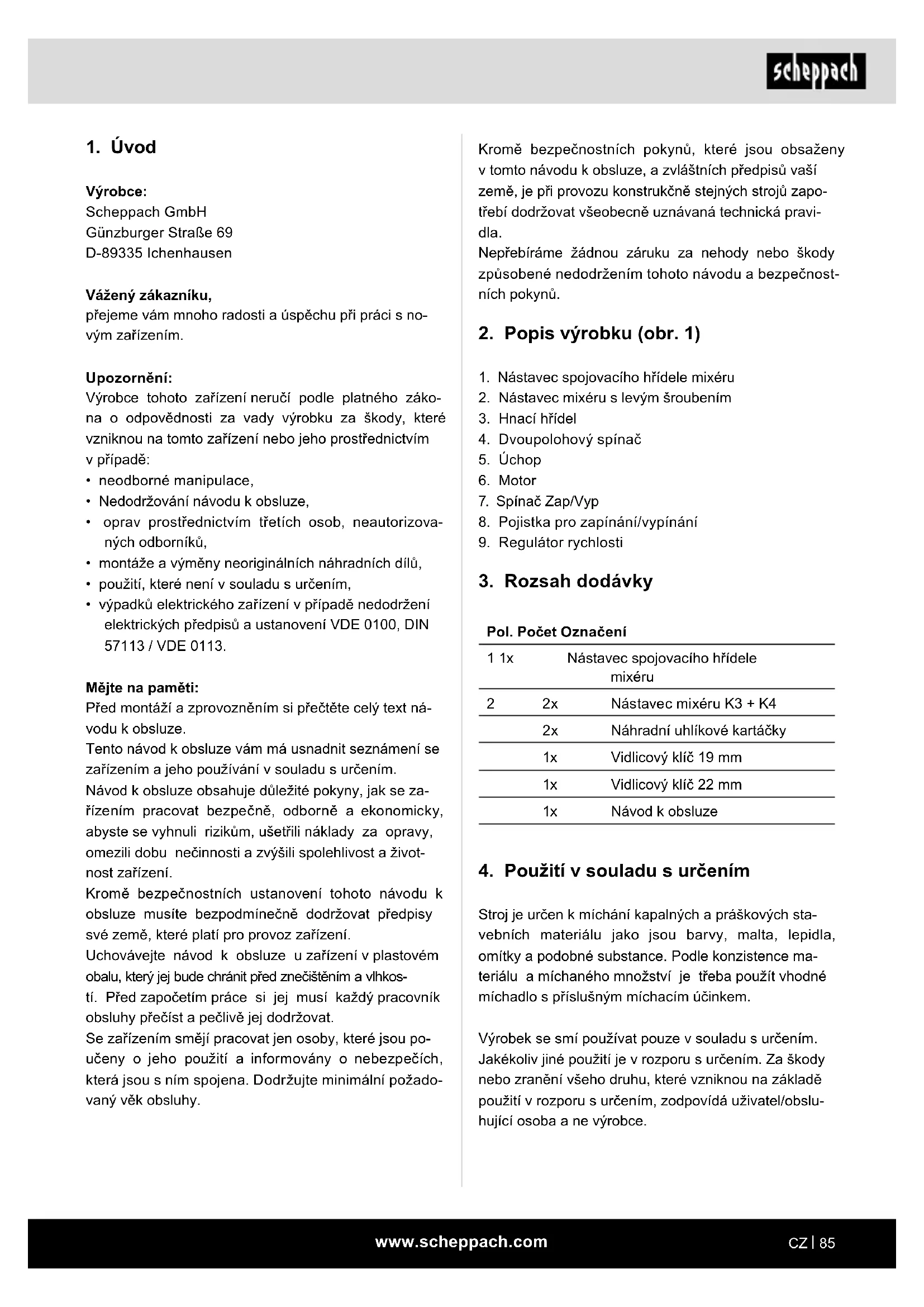 Stroj je určen k míchání kapalných a práškových sta- vebních materiálu jako jsou barvy, malta, lepidla, omítky a podobné substance. Podle konzistence ma- teriálu a míchaného množství je třeba použít vhodné míchadlo s příslušným míchacím účinkem. Výrobek se smí používat pouze v souladu s určením. Jakékoliv jiné použití je v rozporu s určením. Za škody nebo zranění všeho druhu, které vzniknou na základě použití v rozporu s určením, zodpovídá uživatel/obslu- hující osoba a ne výrobce.www.scheppach.com