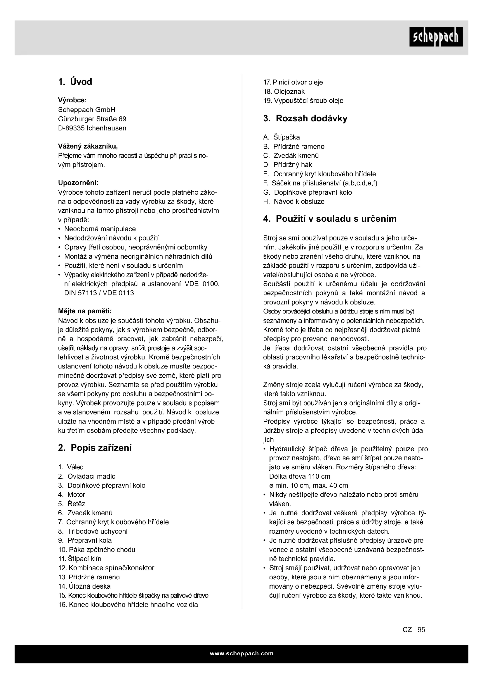 Výrobce: Scheppach GmbH Günzburger Straße 69 D-89335 Ichenhausen Vážený zákazníku, Přejeme vám mnoho radosti a úspěchu při práci s no- vým přístrojem. Upozornění: Výrobce tohoto zařízení neručí podle platného záko- na o odpovědnosti za vady výrobku za škody, které vzniknou na tomto přístroji nebo jeho prostřednictvím v případě: