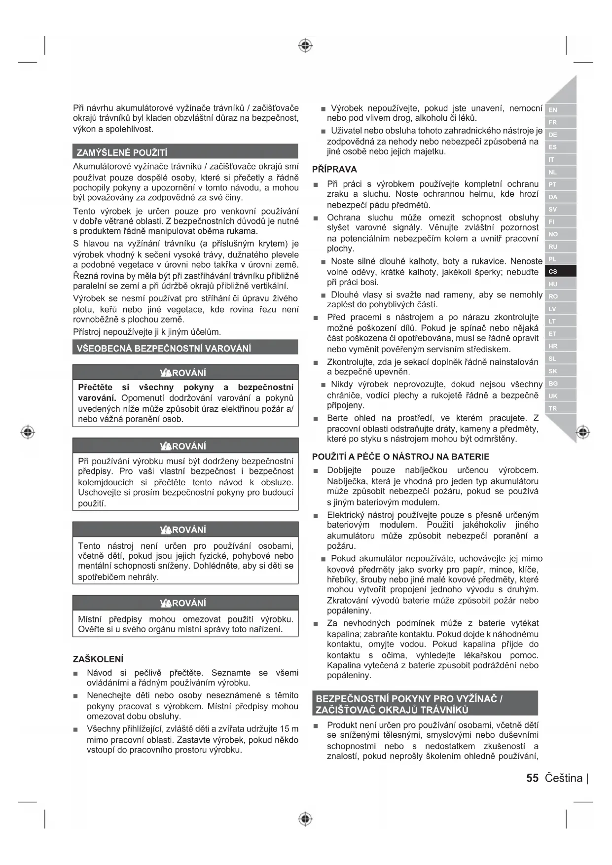 VAROVÁNÍ Přečtěte si všechny pokyny a bezpečnostní varování. Opomenutí dodržování varování a pokynů uvedených níže může způsobit úraz elektřinou požár a/ nebo vážná poranění osob. VAROVÁNÍ Při používání výrobku musí být dodrženy bezpečnostní předpisy. Pro vaši vlastní bezpečnost i bezpečnost kolemjdoucích si přečtěte tento návod k obsluze. Uschovejte si prosím bezpečnostní pokyny pro budoucí použití. VAROVÁNÍ Tento nástroj není určen pro používání osobami, včetně dětí, pokud jsou jejich fyzické, pohybové nebo mentální schopnosti sníženy. Dohlédněte, aby si děti se spotřebičem nehrály. VAROVÁNÍ Místní předpisy mohou omezovat použití výrobku. Ověřte si u svého orgánu místní správy toto nařízení. ZAŠKOLENÍ ■ Návod si pečlivě přečtěte. Seznamte se všemi ovládáními a řádným používáním výrobku. ■ Nenechejte děti nebo osoby neseznámené s těmito pokyny pracovat s výrobkem. Místní předpisy mohou omezovat dobu obsluhy. ■ Všechny přihlížející, zvláště děti a zvířata udržujte 15 m mimo pracovní oblasti. Zastavte výrobek, pokud někdo vstoupí do pracovního prostoru výrobku. ■ Výrobek nepoužívejte, pokud jste unavení, nemocní nebo pod vlivem drog, alkoholu či léků. ■ Uživatel nebo obsluha tohoto zahradnického nástroje je zodpovědná za nehody nebo nebezpečí způsobená na jiné osobě nebo jejich majetku. PŘÍPRAVA ■ Při práci s výrobkem používejte kompletní ochranu zraku a sluchu. Noste ochrannou helmu, kde hrozí nebezpečí pádu předmětů. ■ Ochrana sluchu může omezit schopnost obsluhy slyšet varovné signály. Věnujte zvláštní pozornost na potenciálním nebezpečím kolem a uvnitř pracovní plochy. ■ Noste silné dlouhé kalhoty, boty a rukavice. Nenoste volné oděvy, krátké kalhoty, jakékoli šperky; nebuďte při práci bosi. ■ Dlouhé vlasy si svažte nad rameny, aby se nemohly zaplést do pohyblivých částí. ■ Před pracemi s nástrojem a po nárazu zkontrolujte možné poškození dílů. Pokud je spínač nebo nějaká část poškozena či opotřebována, musí se řádně opravit nebo vyměnit pověřeným servisním střediskem. ■ Zkontrolujte, zda je sekací doplněk řádně nainstalován a bezpečně upevněn. ■ Nikdy výrobek neprovozujte, dokud nejsou všechny chrániče, vodící plechy a rukojetě řádně a bezpečně připojeny. ■ Berte ohled na prostředí, ve kterém pracujete. Z pracovní oblasti odstraňujte dráty, kameny a předměty, které po styku s nástrojem mohou být odmrštěny. POUŽITÍ A PÉČE O NÁSTROJ NA BATERIE ■ Dobíjejte pouze nabíječkou určenou výrobcem. Nabíječka, která je vhodná pro jeden typ akumulátoru může způsobit nebezpečí požáru, pokud se používá s jiným bateriovým modulem. ■ Elektrický nástroj používejte pouze s přesně určeným bateriovým modulem. Použití jakéhokoliv jiného akumulátoru může způsobit nebezpečí poranění a požáru. ■ Pokud akumulátor nepoužíváte, uchovávejte jej mimo kovové předměty jako svorky pro papír, mince, klíče, hřebíky, šrouby nebo jiné malé kovové předměty, které mohou vytvořit propojení jednoho vývodu s druhým. Zkratování vývodů baterie může způsobit požár nebo popáleniny. ■ Za nevhodných podmínek může z baterie vytékat kapalina; zabraňte kontaktu. Pokud dojde k náhodnému kontaktu, omyjte vodou. Pokud kapalina přijde do kontaktu s očima, vyhledejte lékařskou pomoc. Kapalina vytečená z baterie způsobit podráždění nebo popáleniny.