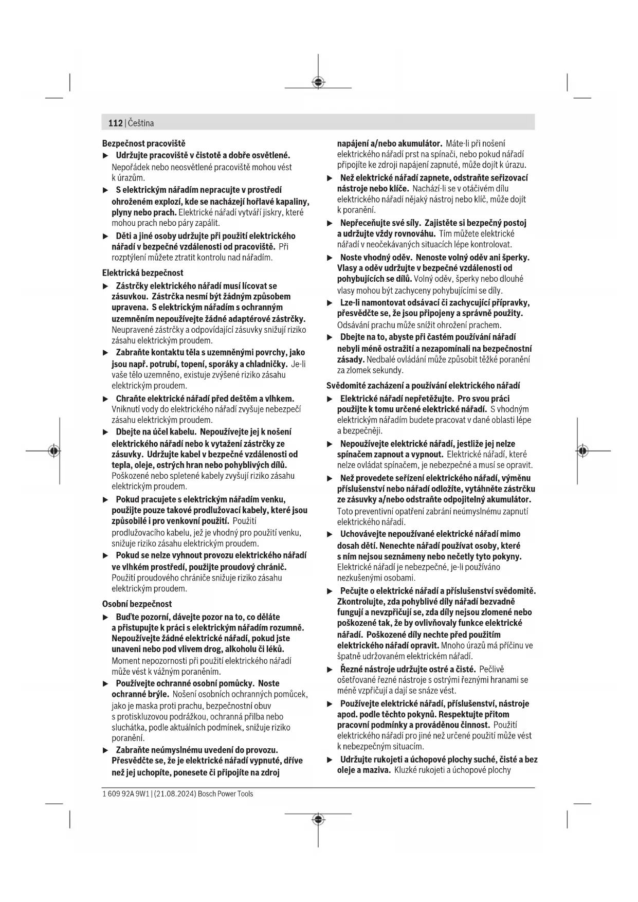 Úroveň vibrací aúroveň hluku, které jsou uvedené vtěchto pokynech, byly změřeny pomocí normované měřicí metody alze je použít pro vzájemné porovnání elektronářadí. Hodí se ipro předběžný odhad zatížení vibracemi ahlukem. Uvedená úroveň vibrací aúroveň hluku reprezentuje hlavní použití elektronářadí. Pokud se ovšem bude elektronářadí používat pro jiné práce, sjinými nástroji nebo snedostatečnou údržbou, může se úroveň hluku aúroveň vibrací lišit. To může zatížení vibracemi ahlukem po celou pracovní dobu zřetelně zvýšit. Pro přesný odhad zatížení vibracemi ahlukem by měly být zohledněny idoby, kdy je nářadí vypnuté nebo běží, ale ve 1 609 92A 9W1 | (21.08.2024) Bosch Power ToolsČeština | 115 skutečnosti se nepoužívá. To může zatížení vibracemi ahlukem po celou pracovní dobu výrazně snížit. Stanovte dodatečná bezpečnostní opatření kochraně obsluhy před účinky vibrací, jako je např. údržba elektronářadí anástrojů, udržování teplých rukou, organizace pracovních procesů. Akumulátor Bosch prodává akumulátorové elektrické nářadí ibez akumulátoru. Na obale je uvedené, zda je součástí dodávky elektrického nářadí akumulátor. Nabíjení akumulátoru u Používejte pouze nabíječky uvedené vtechnických údajích. Jen tyto nabíječky jsou přizpůsobené pro lithium-iontový akumulátor používaný svaším elektronářadím. Upozornění: Lithium-iontové akumulátory se na základě mezinárodních dopravních předpisů dodávají částečně nabité. Aby byl zaručen plný výkon akumulátoru, před prvním použitím akumulátor úplně nabijte. Nasazení akumulátoru Vložte nabitý akumulátor do uchycení akumulátoru tak, aby citelně zaskočil. Vyjmutí akumulátoru Pro vyjmutí akumulátoru stiskněte odjišťovací tlačítko avytáhněte akumulátor. Nepoužívejte přitom násilí. Akumulátorje opatřený 2stupni zajištění, které mají zabránit vypadnutí akumulátoru při neúmyslném stisknutí odjišťovacího tlačítka. Pokud je akumulátor nasazený do elektrického nářadí, drží ho vpříslušné poloze pružina. Ukazatel stavu nabití akumulátoru Upozornění: Ne každý typ akumulátoru má ukazatel stavu nabití. Zelené LED ukazatele stavu nabití akumulátoru indikují stav nabití akumulátoru. Zbezpečnostních důvodů je zjištění stavu nabití možné pouze při vypnutém elektronářadí. Pro zobrazení stavu nabití stiskněte tlačítko ukazatele stavu nabití nebo . Je to možné také při vyjmutém akumulátoru. Pokud po stisknutí tlačítka ukazatele stavu nabití nesvítí žádná LED, je akumulátor vadný amusí se vyměnit. Typ akumulátoru GBA 18V... LED Kapacita Trvale svítí 3 zelené 60–100% Trvale svítí 2 zelené 30–60% Trvale svítí 1 zelená 5–30% Bliká 1 zelená 0–5% Typ akumulátoru ProCORE18V... LED Kapacita Trvale svítí 5 zelených 80–100% Trvale svítí 4 zelené 60–80% Trvale svítí 3 zelené 40–60% Trvale svítí 2 zelené 20–40% Trvale svítí 1 zelená 5–20% Bliká 1 zelená 0–5% Upozornění pro optimální zacházení s akumulátorem Akumulátor chraňte před vlhkostí a vodou. Akumulátor skladujte pouze v teplotním rozmezí od −20 °C do 50 °C. Nenechávejte akumulátor ležet např. v létě v autě. Příležitostně vyčistěte větrací otvory akumulátoru měkkým, čistým a suchým štětcem. Výrazně kratší doba chodu po nabití ukazuje, že je akumulátor opotřebovaný a musí se vyměnit. Dodržujte pokyny pro likvidaci. Montáž u Před každou prací na elektrickém nářadí (např. údržba, výměna nástroje atd.) zněj vyjměte akumulátor. Při neúmyslném stisknutí vypínače hrozí nebezpečí poranění. Přídavná rukojeť u Elektrické nářadí používejte pouze spřídavnou rukojetí (15). u Dbejte na to, aby přídavná rukojeť byla vždy pevně utažená. Jinak můžete při práci nad elektronářadím ztratit kontrolu. Natočení přídavné rukojeti (viz obrázek A) Přídavnou rukojeť (15) můžete libovolně natočit, abyste dosáhli bezpečného pracovního postoje bez únavy. – Otočte dolní část přídavné rukojeti (15) proti směru hodinových ručiček a natočte přídavnou rukojeť (15) do požadované polohy. Poté znovu utáhněte dolní část přídavné rukojeti (15) po směru hodinových ručiček. Dávejte pozor na to, aby byl upínací pásek přídavné rukojeti v drážce na tělese, která je k tomu určená. Volba sklíčidla anástrojů Pro vrtání spříklepem potřebujete nástroje SDSplus, které se nasazují do sklíčidla SDSplus. Pro vrtání bez příklepu do dřeva, kovu, keramiky aplastu atéž pro šroubování se používají nástroje bez SDSplus (např. vrták sválcovou stopkou). Pro tyto nástroje potřebujete ozubené sklíčidlo. Bosch Power Tools 1 609 92A 9W1 | (21.08.2024)116 | Čeština Upozornění: Ozubené sklíčidlo používejte pouze vdruhu provozu vrtání bez příklepu. Výměna sklíčidla Nasazení/vyjmutí ozubeného sklíčidla Abyste mohli pracovat snástroji bez SDSplus (např. svrtákem sválcovou stopkou), musíte namontovat vhodné sklíčidlo (ozubené nebo rychloupínací sklíčidlo). Montáž ozubeného sklíčidla (viz obrázek B) – Našroubujte upínací stopku SDSplus (19) do ozubeného sklíčidla (18). Zajistěte ozubené sklíčidlo (18) pojistným šroubem (17). Dbejte na to, že pojistný šroub má levý závit. Nasazení ozubeného sklíčidla (vizobrázekB) – Nástrčný konec upínací stopky očistěte alehce namažte. – Nasaďte ozubené sklíčidlo otáčivým pohybem upínací stopkou do upínání nástroje tak, aby se samo zajistilo. – Zajištění prověřte tahem za ozubené sklíčidlo. Sejmutí ozubeného sklíčidla – Posuňte zajišťovací objímku (4) dozadu asejměte ozubené sklíčidlo (18).