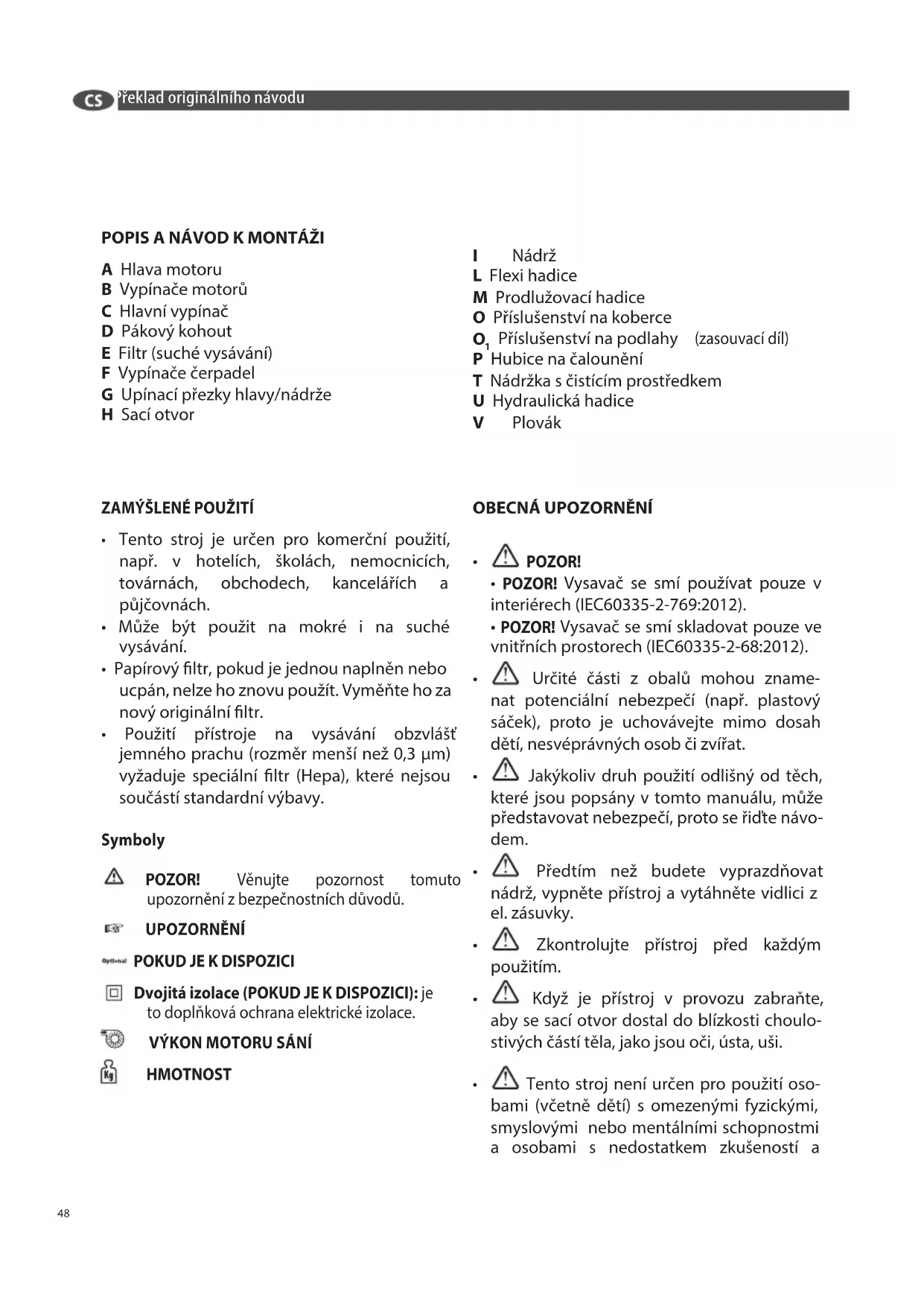 - Použití přístroje na vysávání obzvlášť jemného prachu (rozměr menší než 0,3 µm) vyžaduje speciální ltr (Hepa), které nejsou součástí standardní výbavy. Symboly POZOR! Věnujte pozornost tomuto upozornění z bezpečnostních důvodů. UPOZORNĚNÍ