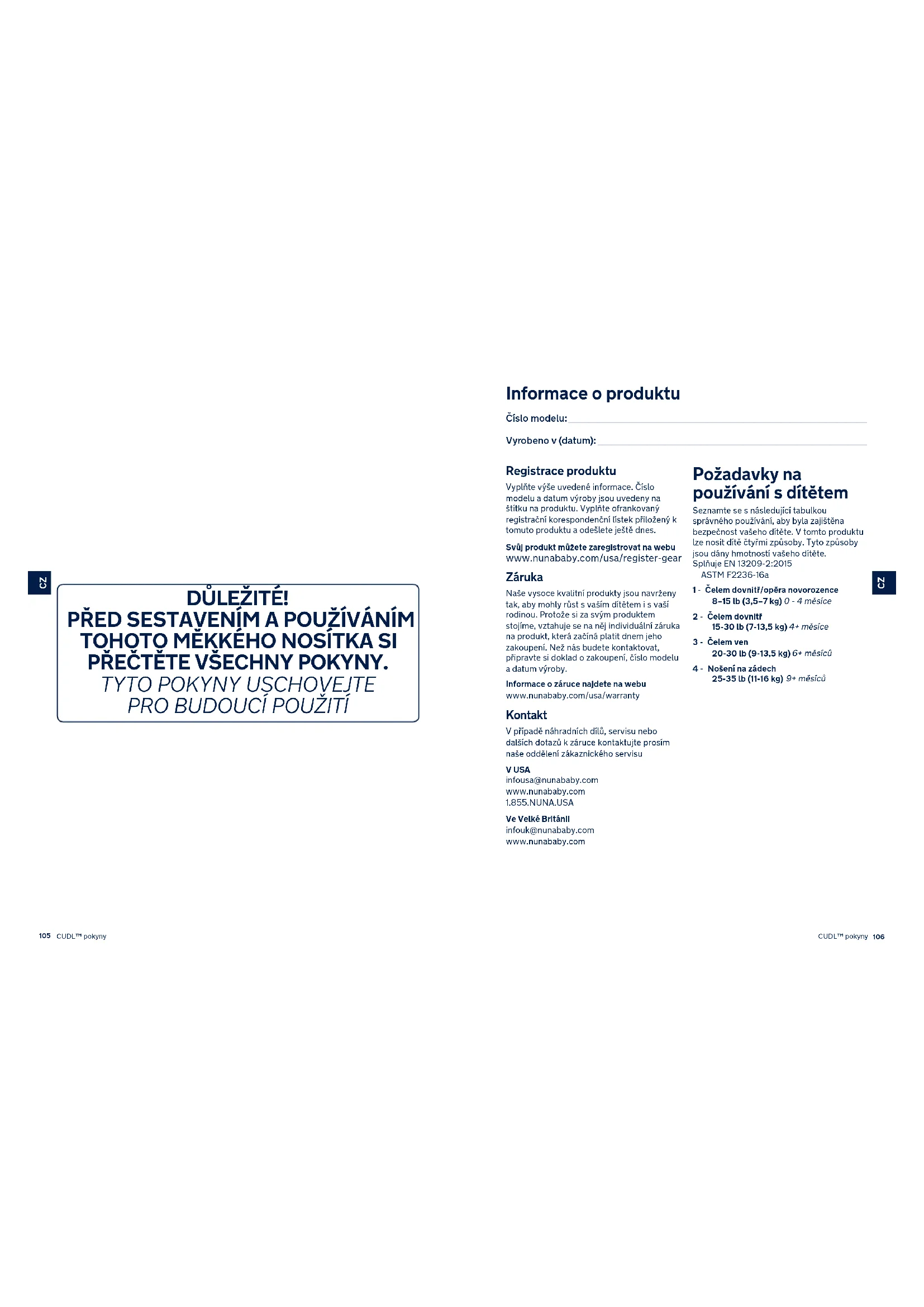 Informace o produktu Číslo modelu: ____________________________________________________________________________________________________________________________________________________ Vyrobeno v (datum): ____________________________________________________________________________________________________________________________________ Registrace produktu Vyplňte výše uvedené informace. Číslo modelu a datum výroby jsou uvedeny na štítku na produktu. Vyplňte ofrankovaný registrační korespondenční lístek přiložený k tomuto produktu a odešlete ještě dnes.Svůj produkt můžete zaregistrovat na webu www.nunababy.com/usa/register-gear Záruka Naše vysoce kvalitní produkty jsou navrženy tak, aby mohly růst s vaším dítětem i s vaší rodinou. Protože si za svým produktem stojíme, vztahuje se na něj individuální záruka na produkt, která začíná platit dnem jeho zakoupení. Než nás budete kontaktovat, připravte si doklad o zakoupení, číslo modelu a datum výroby.Informace o záruce najdete na webu www.nunababy.com/usa/warranty Kontakt V případě náhradních dílů, servisu nebo dalších dotazů k záruce kontaktujte prosím naše oddělení zákaznického servisuV USA infousa@nunababy.com www.nunababy.com 1.855.NUNA.USAVe Velké Británii infouk@nunababy.com www.nunababy.com Požadavky na používání s dítětem Seznamte se s následující tabulkou správného používání, aby byla zajištěna bezpečnost vašeho dítěte. V tomto produktu lze nosit dítě čtyřmi způsoby. Tyto způsoby jsou dány hmotností vašeho dítěte. Splňuje EN 13209-2:2015 ASTM F2236-16a1 - Čelem dovnitř/opěra novorozence 8–15 lb (3,5–7 kg) 0 - 4 měsíce2 - Čelem dovnitř 15-30 lb (7-13,5 kg) 4+ měsíce3 - Čelem ven 20-30 lb (9-13,5 kg) 6+ měsíců4 - Nošení na zádech 25-35 lb (11-16 kg) 9+ měsícůCUDL™ pokynyCUDL™ pokyny