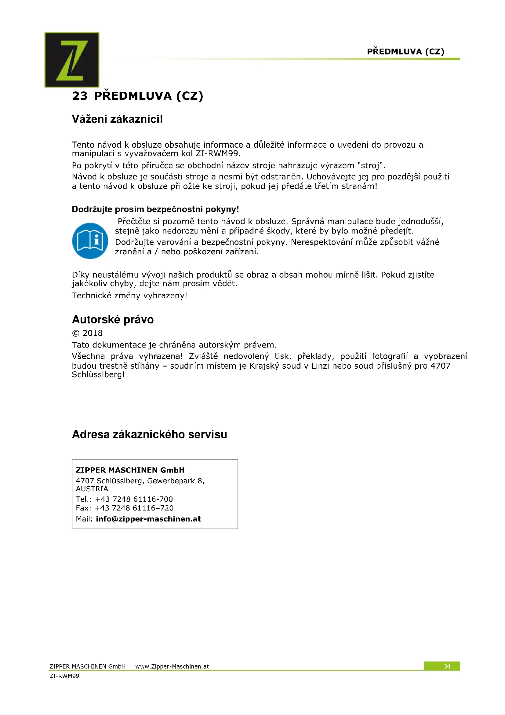 NEBE ZPEČÍ Takovýto bezpečnostní pokyn upozorňuje na bezprostřední nebezpečnou situaci, která může vést k smrti nebo těžkému zranění, pokud není respektován.ZAČÍNÁME ZIPPER MASCHINEN GmbH www.Zipper-Maschinen.at 36 ZI-RWM99