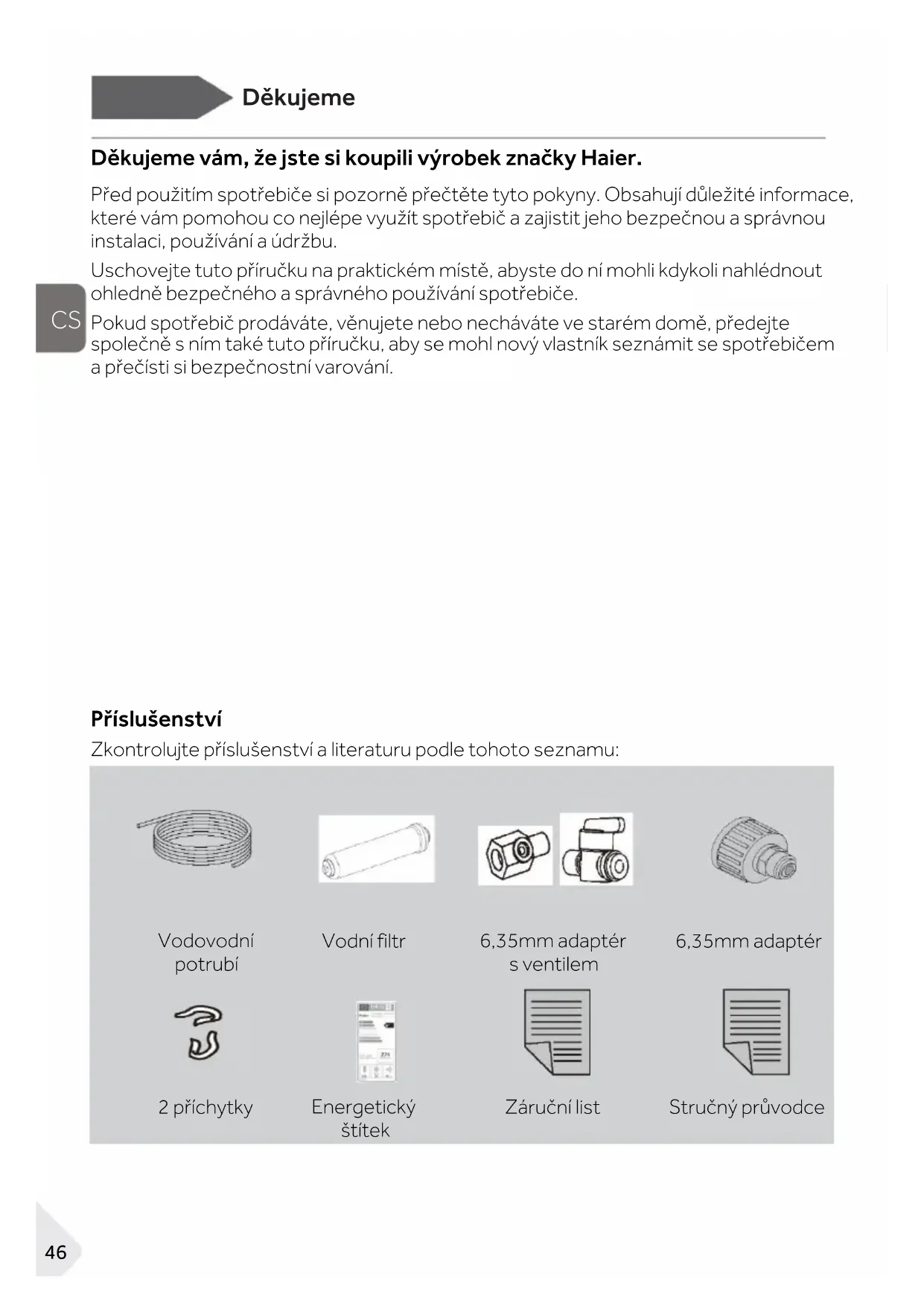 Děkujeme vám, že jste si koupili výrobek značky Haier. Před použitím spotřebiče si pozorně přečtěte tyto pokyny. Obsahují důležité informace, které vám pomohou co nejlépe využít spotřebič a zajistit jeho bezpečnou a správnou instalaci, používání a údržbu. Uschovejte tuto příručku na praktickém místě, abyste do ní mohli kdykoli nahlédnout ohledně bezpečného a správného používání spotřebiče. Pokud spotřebič prodáváte, věnujete nebo necháváte ve starém domě, předejte společně s ním také tuto příručku, aby se mohl nový vlastník seznámit se spotřebičem a přečísti si bezpečnostní varování. Příslušenství Zkontrolujte příslušenství a literaturu podle tohoto seznamu: