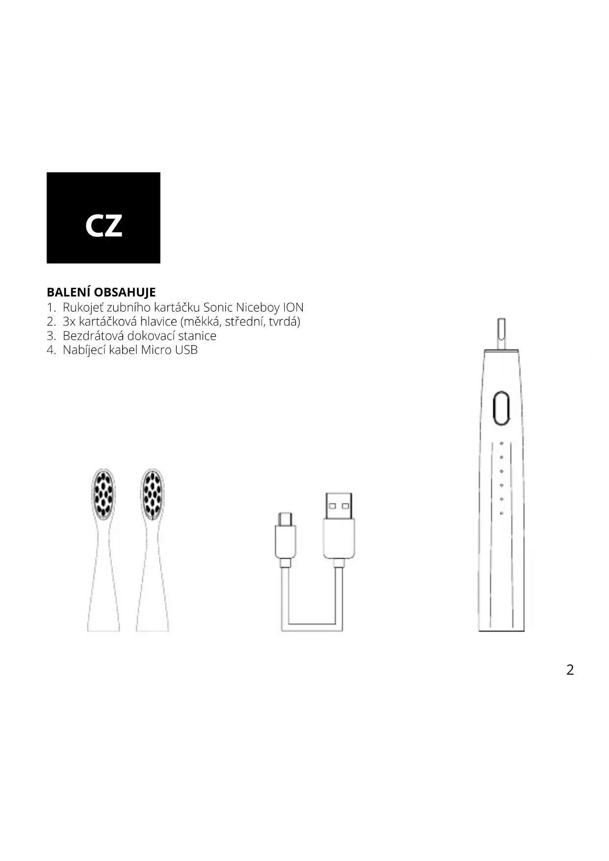 - Zubní kartáček Niceboy ION Sonic splňuje bezpečnostní normy pro elektromagnetická zařízení. Pokud máte kardiostimulátor nebo jiné implantované zařízení, obraťte se před po- užitím kartáčku Niceboy ION Sonic na svého lékaře nebo výrobce implantovaného zařízení.