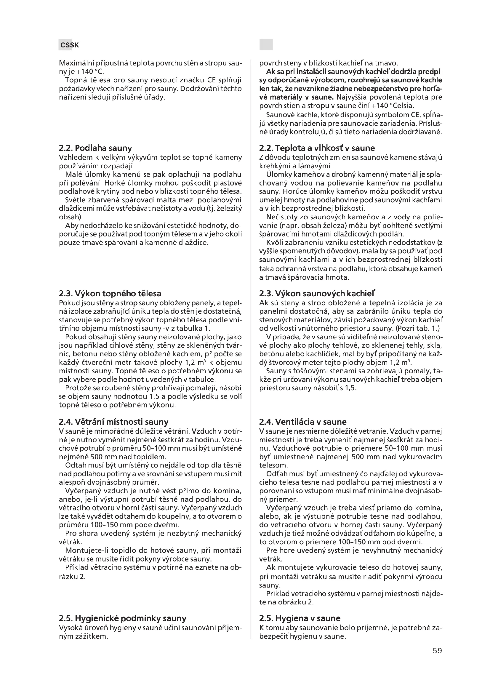 k objemu místnosti sauny. Topné tìleso o potøebném výkonu se pak vybere podle hodnot uvedených v tabulce. Proto¾e se roubené stìny prohøívají pomaleji, násobí se objem sauny hodnotou 1,5 a podle výsledku se volí topné tìleso o potøebném výkonu. 2.4. Vìtrání místnosti sauny V saunì je mimoøádnì dùle¾ité vìtrání. Vzduch v potír- nì je nutno vymìnit nejménì ¹estkrát za hodinu. Vzdu- chové potrubí o prùmìru 50–100 mm musí být umístìné nejménì 500 mm nad topidlem. Odtah musí být umístìný co nejdále od topidla tìsnì nad podlahou potírny a ve srovnání se vstupem musí mít alespoò dvojnásobný prùmìr. Vyèerpaný vzduch je nutné vést pøímo do komína, anebo, je-li výstupní potrubí tìsnì nad podlahou, do vìtracího otvoru v horní èásti sauny. Vyèerpaný vzduch lze také vyvádìt odtahem do koupelny, a to otvorem o prùmìru 100–150 mm pode dveømi. Pro shora uvedený systém je nezbytný mechanický vìtrák. Montujete-li topidlo do hotové sauny, pøi montá¾i vìtráku se musíte øídit pokyny výrobce sauny. Pøíklad vìtracího systému v potírnì naleznete na ob- rázku 2. 2.5. Hygienické podmínky sauny Vysoká úroveò hygieny v saunì uèiní saunování pøíjem- ným zá¾itkem. povrch steny v blízkosti kachieå na tmavo. Ak sa pri in¹talácii saunových kachieå dodr¾ia predpi- sy odporúèané výrobcom, rozohrejú sa saunové kachle len tak, ¾e nevznikne ¾iadne nebezpeèenstvo pre horåa- vé materiály v saune. Najvy¹¹ia povolená teplota pre povrch stien a stropu v saune èiní +140 °Celsia. Saunové kachle, ktoré disponujú symbolom CE, spÍòa- jú v¹etky nariadenia pre saunovacie zariadenia. Príslu¹- né úrady kontrolujú, èi sú tieto nariadenia dodr¾iavané. 2.2. Teplota a vlhkos» v saune Z dôvodu teplotných zmien sa saunové kamene stávajú krehkými a lámavými. Úlomky kameòov a drobný kamenný materiál je spla- chovaný vodou na polievanie kameòov na podlahu sauny. Horúce úlomky kameòov mô¾u po¹kodi» vrstvu umelej hmoty na podlahovine pod saunovými kachåami a v ich bezprostrednej blízkosti. Neèistoty zo saunových kameòov a z vody na polie- vanie (napr. obsah ¾eleza) mô¾u by» pohltené svetlými ¹párovacími hmotami dla¾dicových podláh. Kvôli zabráneniu vzniku estetických nedodstatkov (z vy¹¹ie spomenutých dôvodov), mala by sa pou¾íva» pod saunovými kachåami a v ich bezprostrednej blízkosti taká ochranná vrstva na podlahu, ktorá obsahuje kameò a tmavá ¹párovacia hmota. 2.3. Výkon saunových kachieå Ak sú steny a strop oblo¾ené a tepelná izolácia je za panelmi dostatoèná, aby sa zabránilo úniku tepla do stenových materiálov, závisí po¾adovaný výkon kachieå od veåkosti vnútorného priestoru sauny. (Pozri tab. 1.) V prípade, ¾e v saune sú viditeåné neizolované steno- vé plochy ako plochy tehlové, zo sklenenej tehly, skla, betónu alebo kachlièiek, mal by by» pripoèítaný na ka¾- dý ¹tvorcový meter tejto plochy objem 1,2 m