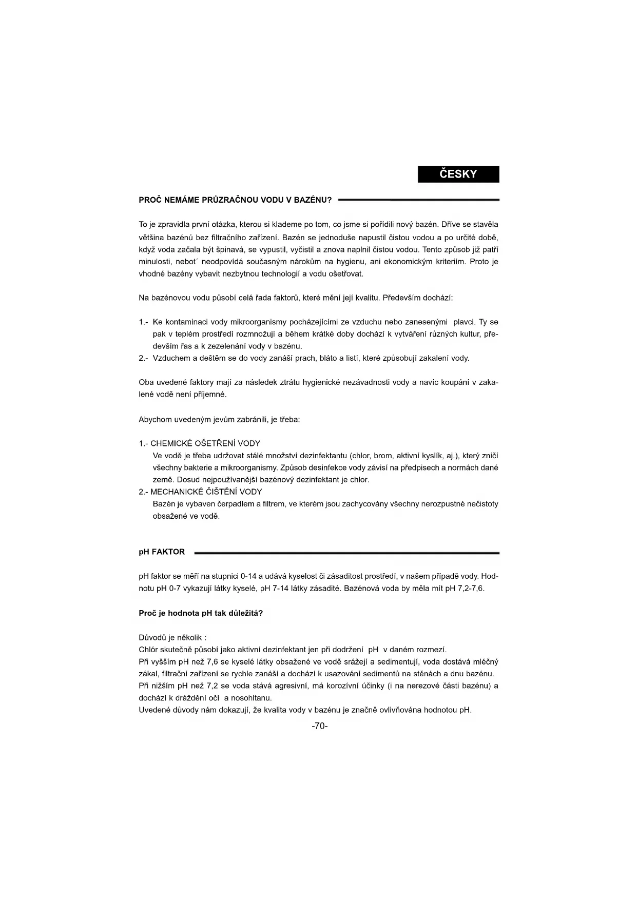 Bazén je vybaven èerpadlem a filtrem, ve kterém jsou zachycovány všechny nerozpustné neèistoty obsažené ve vodì. pH FAKTOR pH faktor se mìøí na stupnici 0-14 a udává kyselost èi zásaditost prostøedí, v našem pøípadì vody. Hod- notu pH 0-7 vykazují látky kyselé, pH 7-14 látky zásadité. Bazénová voda by mìla mít pH 7,2-7,6. Proè je hodnota pH tak dùležitá? Dùvodù je nìkolik : Chlór skuteènì pùsobí jako aktivní dezinfektant jen pøi dodržení pH v daném rozmezí. Pøi vyšším pH než 7,6 se kyselé látky obsažené ve vodì srážejí a sedimentují, voda dostává mléèný zákal, filtraèní zaøízení se rychle zanáší a dochází k usazování sedimentù na stìnách a dnu bazénu. Pøi nižším pH než 7,2 se voda stává agresivní, má korozívní úèinky (i na nerezové èásti bazénu) a dochází k dráždìní oèí a nosohltanu. Uvedené dùvody nám dokazují, že kvalita vody v bazénu je znaènì ovlivòována hodnotou pH. ÈESKY -70-CHLÓR Závazný pøedpis Dle platné vyhlášky è. 464 MZ obsah VOLNÉHO CHLÓRU v bazénové vodì nemá pøesáhnout hodnotu 0,3-0,5 mg/l (g/m