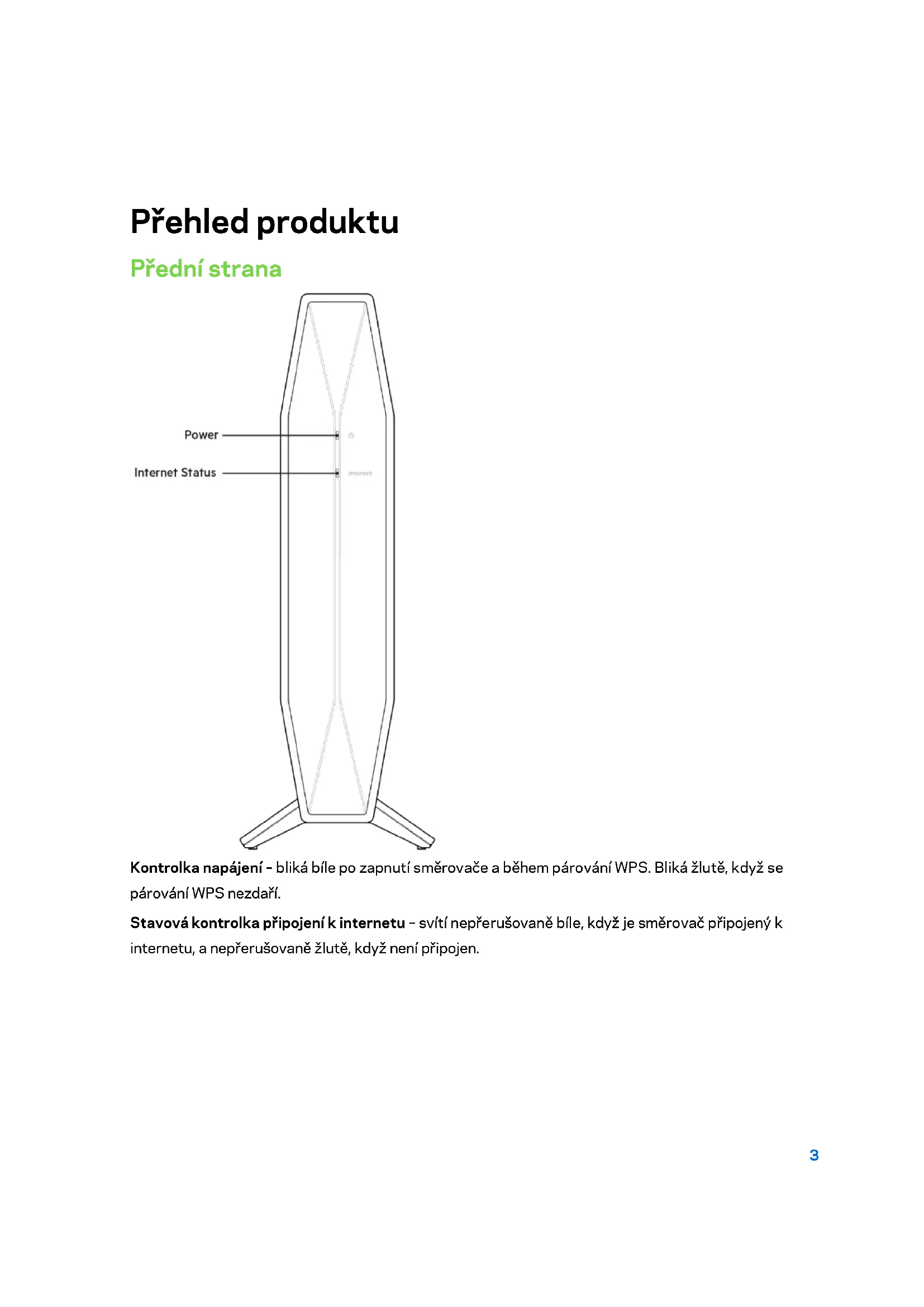 - Prostředí Přehled produktu Přední strana Kontrolka napájení – bliká bíle po zapnutí směrovače a během párování WPS. Bliká žlutě, když se párování WPS nezdaří. Stavová kontrolka připojení k internetu – svítí nepřerušovaně bíle, když je směrovač připojený k internetu, a nepřerušovaně žlutě, když není připojen.4 Zadní strana Tlačítko Wi-Fi Protected Setup™ (WPS) (1) p. 213
