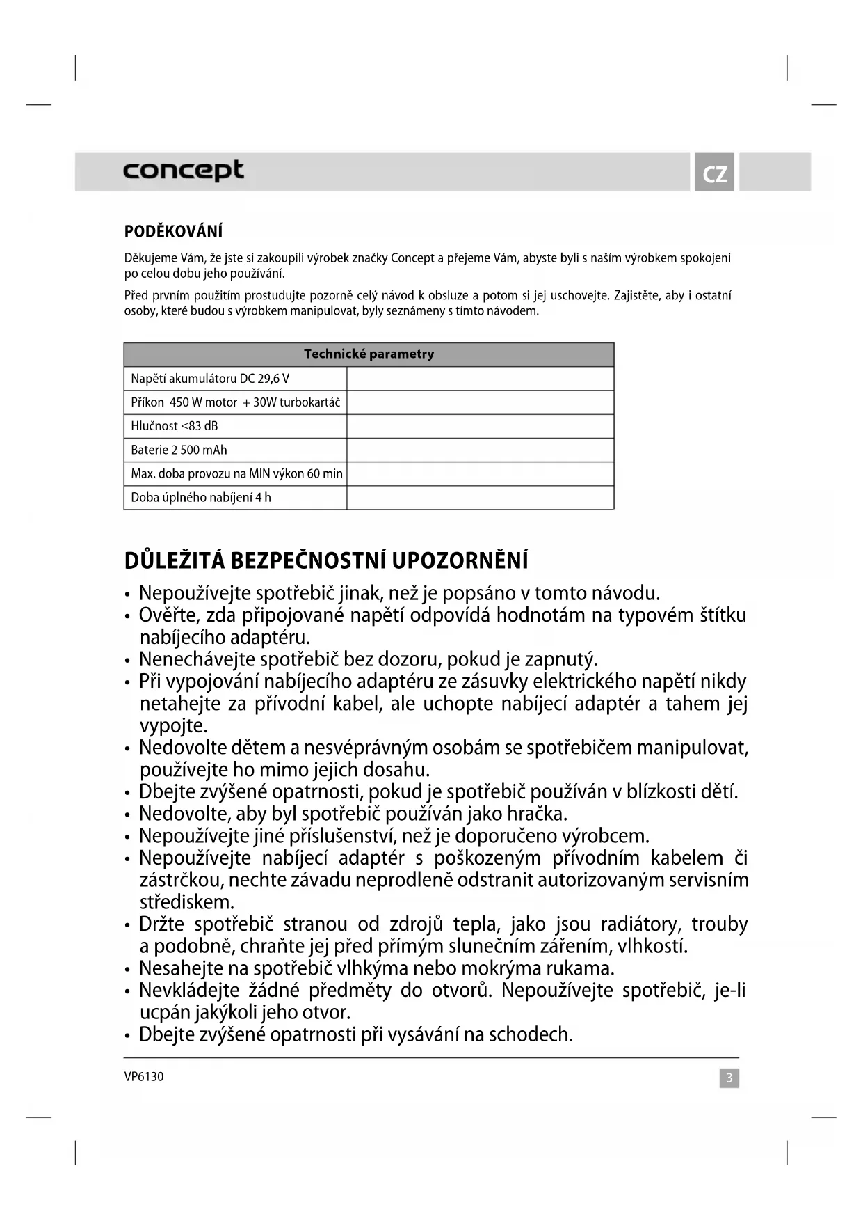 Děkujeme Vám, že jste si zakoupili výrobek značky Concept a přejeme Vám, abyste byli s naším výrobkem spokojeni po celou dobu jeho používání. Před prvním použitím prostudujte pozorně celý návod k obsluze a potom si jej uschovejte. Zajistěte, aby i ostatní osoby, které budou s výrobkem manipulovat, byly seznámeny s tímto návodem. Technické parametry Napětí akumulátoru DC 29,6 V Příkon 450 W motor + 30W turbokartáč Hlučnost ≤83 dB Baterie 2 500 mAh Max. doba provozu na MIN výkon 60 min Doba úplného nabíjení 4 h DŮLEŽITÁ BEZPEČNOSTNÍ UPOZORNĚNÍ