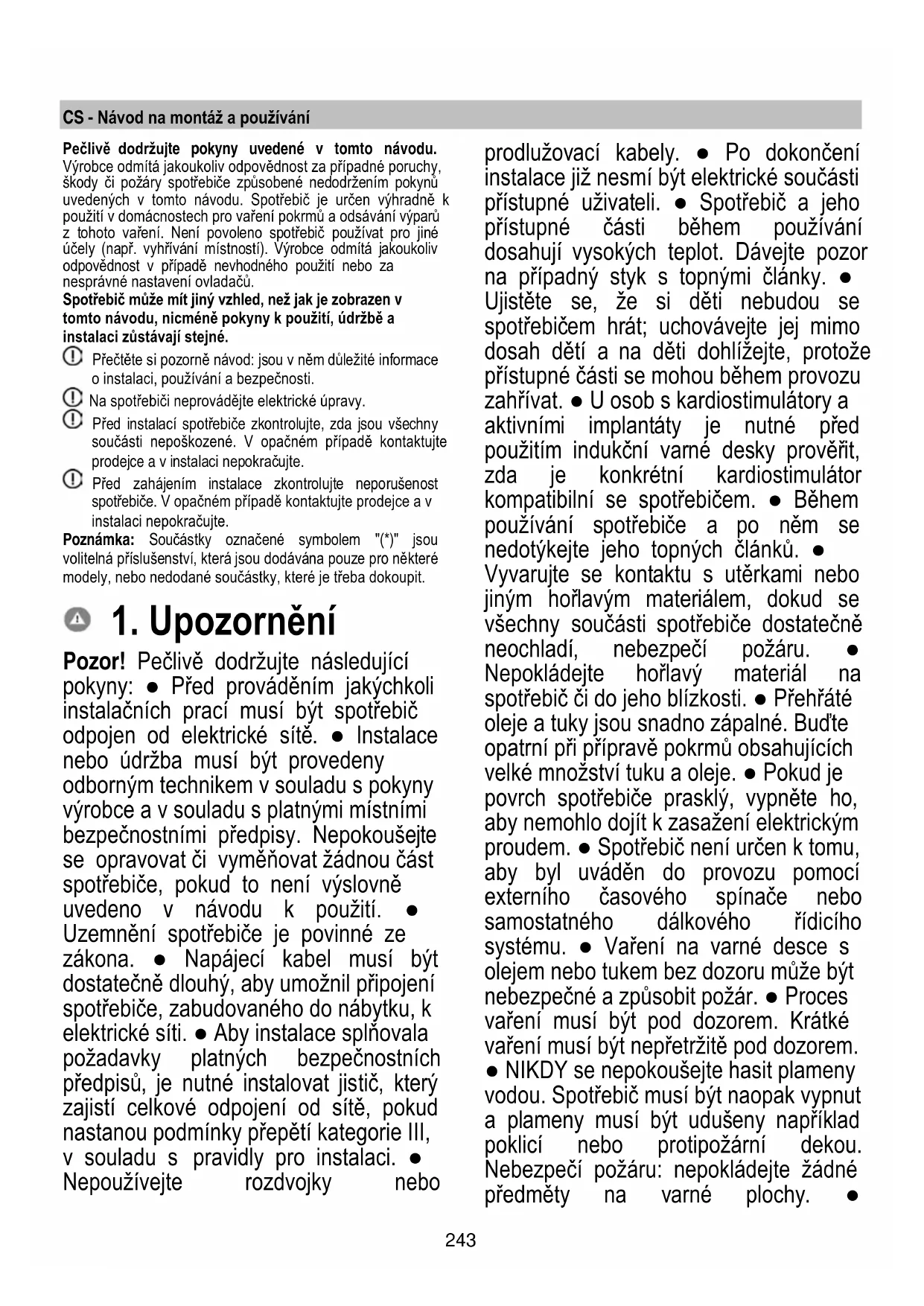 Pozor! Pečlivě dodržujte následující pokyny: ● Před prováděním jakýchkoli instalačních prací musí být spotřebič odpojen od elektrické sítě. ● Instalace nebo údržba musí být provedeny odborným technikem v souladu s pokyny výrobce a v souladu s platnými místními bezpečnostními předpisy. Nepokoušejte se opravovat či vyměňovat žádnou část spotřebiče, pokud to není výslovně uvedeno v návodu k použití. ● Uzemnění spotřebiče je povinné ze zákona. ● Napájecí kabel musí být dostatečně dlouhý, aby umožnil připojení spotřebiče, zabudovaného do nábytku, k elektrické síti. ● Aby instalace splňovala požadavky platných bezpečnostních předpisů, je nutné instalovat jistič, který zajistí celkové odpojení od sítě, pokud nastanou podmínky přepětí kategorie III, v souladu s pravidly pro instalaci. ● Nepoužívejte rozdvojky nebo prodlužovací kabely. ● Po dokončení instalace již nesmí být elektrické součásti přístupné uživateli. ● Spotřebič a jeho přístupné části během používání dosahují vysokých teplot. Dávejte pozor na případný styk s topnými články. ● Ujistěte se, že si děti nebudou se spotřebičem hrát; uchovávejte jej mimo dosah dětí a na děti dohlížejte, protože přístupné části se mohou během provozu zahřívat. ● U osob s kardiostimulátory a aktivními implantáty je nutné před použitím indukční varné desky prověřit, zda je konkrétní kardiostimulátor kompatibilní se spotřebičem. ● Během používání spotřebiče a po něm se nedotýkejte jeho topných článků. ● Vyvarujte se kontaktu s utěrkami nebo jiným hořlavým materiálem, dokud se všechny součásti spotřebiče dostatečně neochladí, nebezpečí požáru. ● Nepokládejte hořlavý materiál na spotřebič či do jeho blízkosti. ● Přehřáté oleje a tuky jsou snadno zápalné. Buďte opatrní při přípravě pokrmů obsahujících velké množství tuku a oleje. ● Pokud je povrch spotřebiče prasklý, vypněte ho, aby nemohlo dojít k zasažení elektrickým proudem. ● Spotřebič není určen k tomu, aby byl uváděn do provozu pomocí externího časového spínače nebo samostatného dálkového řídicího systému. ● Vaření na varné desce s olejem nebo tukem bez dozoru může být nebezpečné a způsobit požár. ● Proces vaření musí být pod dozorem. Krátké vaření musí být nepřetržitě pod dozorem. ● NIKDY se nepokoušejte hasit plameny vodou. Spotřebič musí být naopak vypnut a plameny musí být udušeny například poklicí nebo protipožární dekou. Nebezpečí požáru: nepokládejte žádné předměty na varné plochy. ●244 Nepoužívejte parní čističe, hrozí nebezpečí úrazu elektrickým proudem. ● Na povrch varné desky neumisťujte kovové předměty, jako jsou nože, vidličky, lžíce a víka, protože by se mohly přehřát. ● Před připojením spotřebiče k elektrické síti: zkontrolujte typový štítek (umístěný na spodní straně spotřebiče), aby se ujistili, že napětí a výkon odpovídají napětí v síti a připojovací zásuvka je vhodného typu. V případě pochyb se obraťte na kvalifikovaného elektrikáře. Důležité: ● Po použití varnou desku vypněte pomocí ovládacího zařízení a nespoléhejte se na detektor hrnců. ● Vyvarujte se přelití tekutiny, a proto při vaření nebo ohřevu tekutin snižte přívod tepla. ● Neponechávejte zapnuté topné články s prázdnými hrnci a pánvemi nebo bez nádob. ● Po dokončení vaření vypněte relativní varnou zónu. ● Nikdy k vaření nepoužívejte alobal a nikdy přímo neumísťujte výrobky zabalené v hliníkové fólii. Alobal by se mohl roztavit a došlo by k vážnému poškození vašeho spotřebiče. ● Nikdy neohřívejte ještě zavřené potravinové konzervy či plechovky: mohly by vybouchnout! Tato upozornění jsou platná i pro všechny ostatní typy varných desek. ● Použití vysokého výkonu, jako při funkci Booster, není vhodné pro ohřev určitých typů tekutin, jako například oleje na smažení. Přílišná teplota by mohla být nebezpečná. V těchto případech doporučujeme používat nižší výkon. ● Nádoby musí být umístěny přímo na varnou desku a musí být vystředěny. V žádném případě nevkládejte mezi hrnce a varnou desku jiné předměty. ● V případě vysokých teplot spotřebič automaticky snižuje úroveň výkonu varných zón. ● Před jakýmkoli čištěním nebo údržbou odpojte spotřebič od napájení odpojením zástrčky nebo odpojením hlavního vypínače obydlí. ● Při všech instalacích a údržbě používejte pracovní rukavice. ● Spotřebič mohou používat děti ve věku nejméně 8 let a osoby se sníženými fyzickými, smyslovými nebo mentálními schopnostmi nebo bez zkušeností či potřebných znalostí, za předpokladu, že jsou pod dohledem nebo poté, co obdržely pokyny týkající se bezpečného používání spotřebiče a pochopily s tím související nebezpečí. ● Děti musí být pod dozorem, aby si se spotřebičem nehrály. ● Čištění a údržbu nesmí provádět děti bez dozoru. ● Místnost musí mít dostatečné větrání, pokud je spotřebič používán současně s jinými spotřebiči na plyn nebo jiné palivo. ● Spotřebič musí být často čištěn zevnitř i zvenku (ALESPOŇ JEDNOU MĚSÍČNĚ), v každém případě dodržujte to, co je výslovně uvedeno v pokynech pro údržbu. ● Nedodržení pravidel pro čištění spotřebiče a pro výměnu a čištění filtrů představuje nebezpečí požáru. ● Vaření plamenem (flambování) je přísně zakázáno. ● Použití volných plamenů je nebezpečné pro filtry a mohlo by způsobit požár, a proto je třeba se ho v každém případě vyvarovat. ● Smažení se musí provádět pod kontrolou,