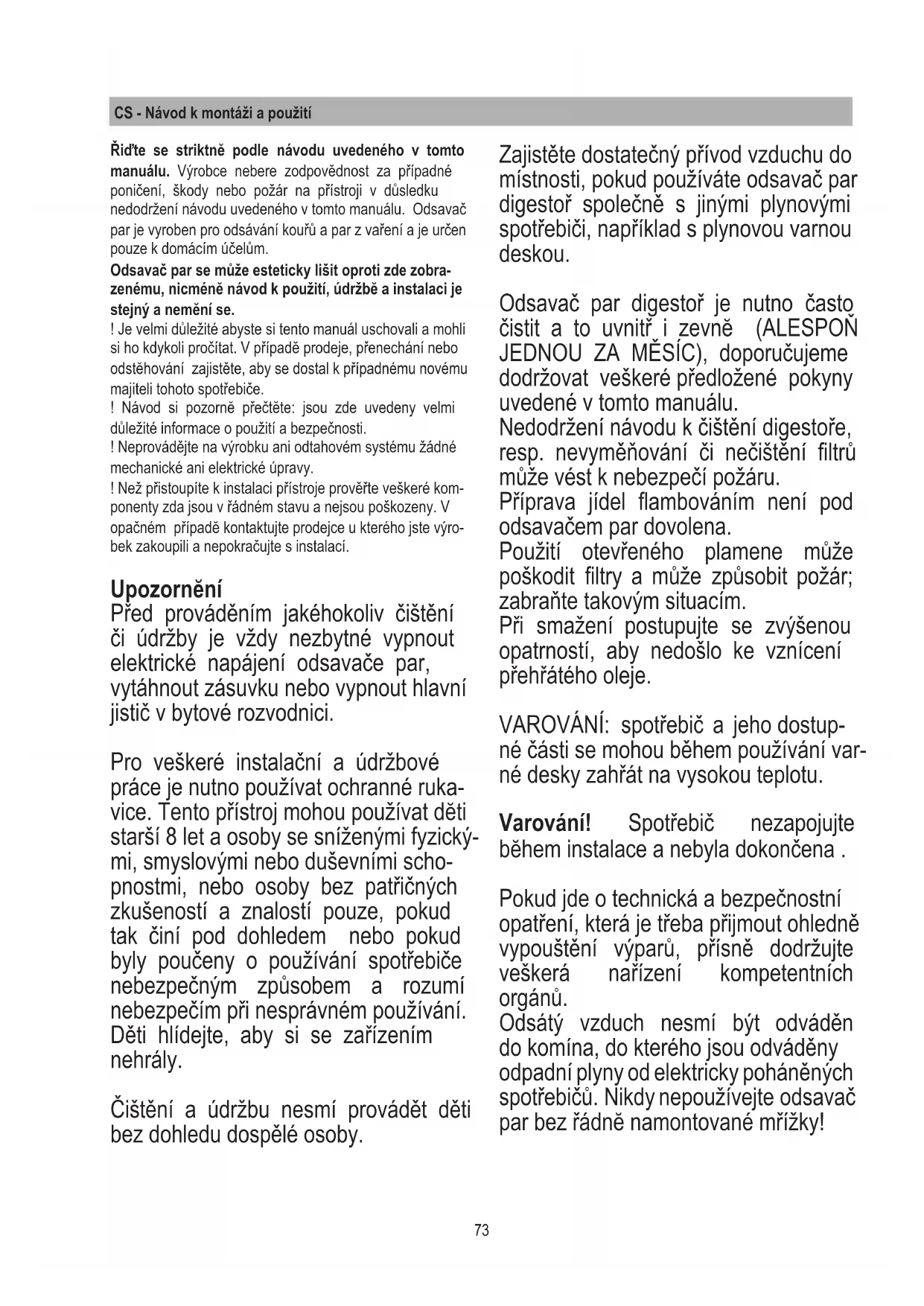 3-2; CEI/EN 61000-3-3. Doporučení správného třídĕní ke snížení zátĕže životního prostředí: Jakmile začínáte vařit, nastavte odsavač par na mini- mální výkon či rychlost a po skončení vaření nechte ho ještě nĕkolik minut zapnutý. Můžete zvýšit výkon odsávání jen v případĕ přílišných výparů a kouře, funkci booster používejte jen v mimořádných situacích. Abyste mo- hli využívat a účinnĕ zajistit režim odsávání pachů a jakmile je nutno vymĕnit uhlíkový ltr/y. Tukový ltr či odlučovač tuku je nutno čistit jen pokud je nutno. Pokud chcete optimalizovat účinnost a snižovat hlučnost, použijte maximální průměr odvodové roury uve- dený v tomto manuálu.75 Používání Odsavač par je vyroben pro provoz s odvětráním nebo s vnitřní cirkulací vzduchu. Verze s venkovním odtahem Výpary jsou odsávány vně odvodovou rourou připevněnou k přírubĕ spojo- vacího prstence. Průměr odvodové roury se musí shodo- vat s průměrem spojovacího prstence. Pozor! Odvodová roura není dodává- na a je nutno si ji objednat či zakoupit. Na vodorovných úsecích roury je třeba zajistit mírný spád (cca 10°) stoupající směrem k vyústění do vnější atmosfé- ry. Má-li odsavač par uhlíkové ltrační vložky, je nutno je vytáhnout. Filtrační verze Nasávaný vzduch je odloučený od tuků předtím, než je veden zpĕt do místnosti. Abyste mohli použít tuto verzi odsavače, je nutno instalovat dodatečný ltrační systém s aktivními uhlíky. Poznámka: recyklovaný vzduch uhlíko- vými ltry je vypouštĕn odvodní rourou s výustkou do kuchynĕ na boční stranu kuchyňské skříňky. Instalace Poznámka: instalaci je nutno provést tak, aby mohl být neustále zajištěn přístup k odsavači par a k elektronickým komponentům kvůli technickým nebo servisním zásahům. UPOZORNĚNÍ: kovovou krabičku s elektronickými komponenty položte 65 cm dál od varné desky a ne blíže, nebo alespoň 65 cm vzdálenou od bodu odsávání odsavače par. Doporučení: Doporučujeme instalo- vat kovovou krabičku s elektronickými komponenty ve výšce alespoň 10 cm od podlahy a tak, aby byla dostatečné vzdá- lenosti od všech tepelných zdrojů (např.: bok trouby nebo povrch plotýnek). Jestliže je v pokynech k instalaci spotřebiče určena větší vzdálenost než uvedená, je nutné ji dodržet a postupo- vat dle příslušných pokynů. Elektrické spojení Elektrické připojení odsavače par smí provádět pouze k tomu kvalikovaný specializovaný personál. Zkontrolujte, zda napětí uvedené na typovém štítku spotřebiče odpovídá napětí v síti. Pokud je odsavač par vyba- ven zástrčkou, připojte ho i po instalaci k snadno přístupné zásuvce odpovída- jící platným normám. Pokud není vyba- ven zástrčkou (přímé napojení do sítě), nebo zásuvka není umístěna na snadno přístupném místě, použijte dvoupólový vypínač odpovídající platným předpisům, který zajistí úplné odpojení od sítě v případě přepětí kategorie III v souladu s instalačními předpisy. Pozor! Před napěťovým kontaktem odsavače par a funkční kontrolou, zkontrolujte zda kabel byl zasunut v příslušné poloze. Montáž Po vybalení spotřebiče zkontrolujte, zda nedošlo k jeho poškození při přepravě, zda veškeré komponenty nejsou poškozeny. V případě problémů kon- taktujte prodejce nebo servisní středisko a nepokračujte v montáži. Tento návod je opatřen důležitými zprávami ohledně bezpečnosti, které je třeba si přečíst a vždy se podle nich řídit.76