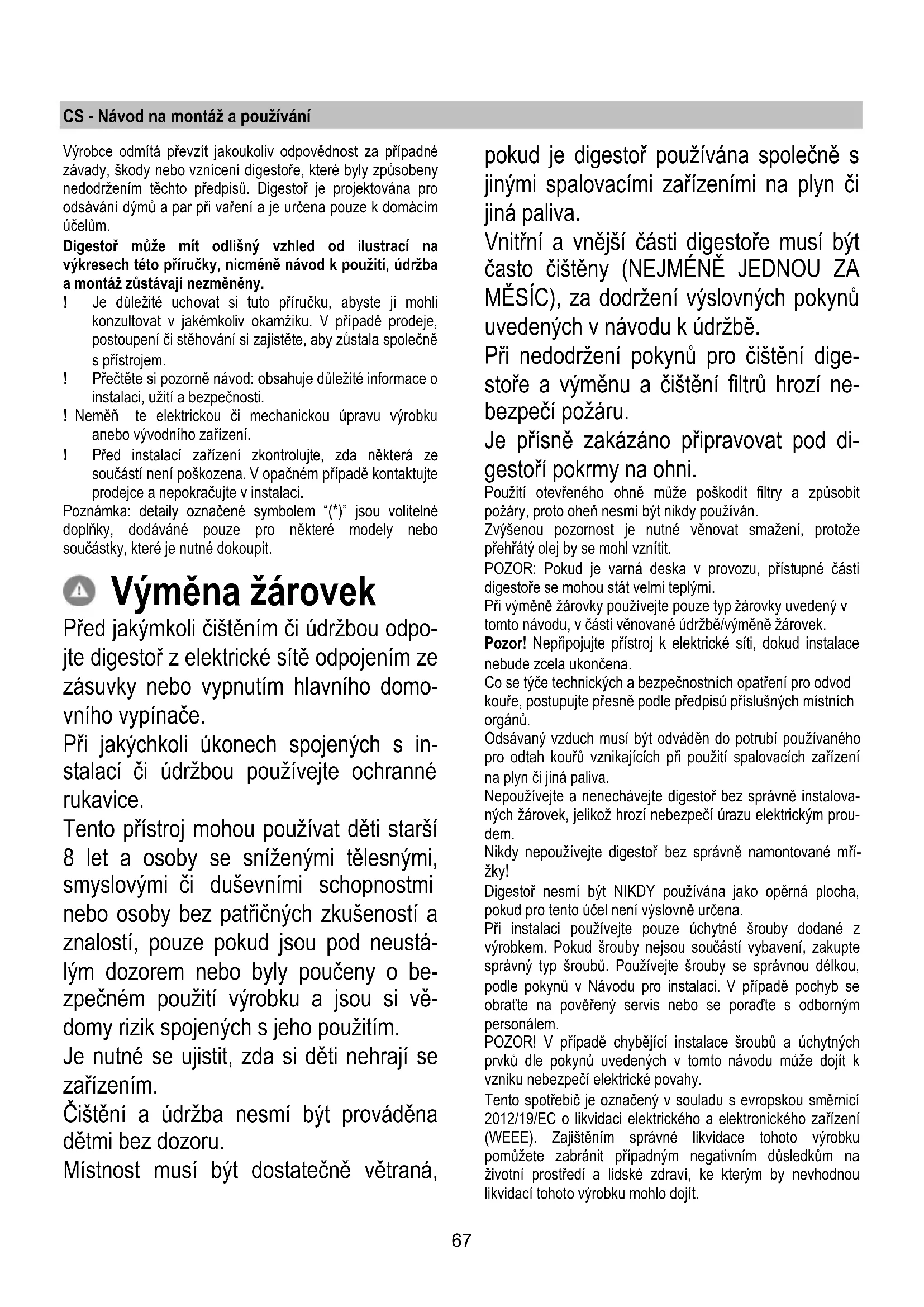 W przypadku, gdy oświetlenie nie działa należy najpierw sprawdzić, czy lampki zostały prawidłowo zamontowane. Jeżeli po przeprowadzeniu takiej kontroli oświetlenie nadal nie działa, należy zwrócić się do serwisu.67 CS - Návod na montáž a používání Výrobce odmítá převzít jakoukoliv odpovědnost za případné závady, škody nebo vznícení digestoře, které byly způsobeny nedodržením těchto předpisů. Digestoř je projektována pro odsávání dýmů a par při vaření a je určena pouze k domácím účelům. Digestoř může mít odlišný vzhled od ilustrací na výkresech této příručky, nicméně návod k použití, údržba a montáž zůstávají nezměněny. ! Je důležité uchovat si tuto příručku, abyste ji mohli konzultovat v jakémkoliv okamžiku. V případě prodeje, postoupení či stěhování si zajistěte, aby zůstala společně s přístrojem. ! Přečtěte si pozorně návod: obsahuje důležité informace o instalaci, užití a bezpečnosti. ! Neměň te elektrickou či mechanickou úpravu výrobku anebo vývodního zařízení. ! Před instalací zařízení zkontrolujte, zda některá ze součástí není poškozena. V opačném případě kontaktujte prodejce a nepokračujte v instalaci. Poznámka: detaily označené symbolem “(*)” jsou volitelné doplňky, dodáváné pouze pro některé modely nebo součástky, které je nutné dokoupit. Výměna žárovek Před jakýmkoli čištěním či údržbou odpo- jte digestoř z elektrické sítě odpojením ze zásuvky nebo vypnutím hlavního domo- vního vypínače. Při jakýchkoli úkonech spojených s in- stalací či údržbou používejte ochranné rukavice. Tento přístroj mohou používat děti starší 8 let a osoby se sníženými tělesnými, smyslovými či duševními schopnostmi nebo osoby bez patřičných zkušeností a znalostí, pouze pokud jsou pod neustá- lým dozorem nebo byly poučeny o be- zpečném použití výrobku a jsou si vě- domy rizik spojených s jeho použitím. Je nutné se ujistit, zda si děti nehrají se zařízením. Čištění a údržba nesmí být prováděna dětmi bez dozoru. Místnost musí být dostatečně větraná, pokud je digestoř používána společně s jinými spalovacími zařízeními na plyn či jiná paliva. Vnitřní a vnější části digestoře musí být často čištěny (NEJMÉNĚ JEDNOU ZA MĚSÍC), za dodržení výslovných pokynů uvedených v návodu k údržbě. Při nedodržení pokynů pro čištění dige- stoře a výměnu a čištění filtrů hrozí ne- bezpečí požáru. Je přísně zakázáno připravovat pod di- gestoří pokrmy na ohni. Použití otevřeného ohně může poškodit filtry a způsobit požáry, proto oheň nesmí být nikdy používán. Zvýšenou pozornost je nutné věnovat smažení, protože přehřátý olej by se mohl vznítit. POZOR: Pokud je varná deska v provozu, přístupné části digestoře se mohou stát velmi teplými. Při výměně žárovky používejte pouze typ žárovky uvedený v tomto návodu, v části věnované údržbě/výměně žárovek. Pozor! Nepřipojujte přístroj k elektrické síti, dokud instalace nebude zcela ukončena. Co se týče technických a bezpečnostních opatření pro odvod kouře, postupujte přesně podle předpisů příslušných místních orgánů. Odsávaný vzduch musí být odváděn do potrubí používaného pro odtah kouřů vznikajících při použití spalovacích zařízení na plyn či jiná paliva. Nepoužívejte a nenechávejte digestoř bez správně instalova- ných žárovek, jelikož hrozí nebezpečí úrazu elektrickým prou- dem. Nikdy nepoužívejte digestoř bez správně namontované mří- žky! Digestoř nesmí být NIKDY používána jako opěrná plocha, pokud pro tento účel není výslovně určena. Při instalaci používejte pouze úchytné šrouby dodané z výrobkem. Pokud šrouby nejsou součástí vybavení, zakupte správný typ šroubů. Používejte šrouby se správnou délkou, podle pokynů v Návodu pro instalaci. V případě pochyb se obraťte na pověřený servis nebo se poraďte s odborným personálem. POZOR! V případě chybějící instalace šroubů a úchytných prvků dle pokynů uvedených v tomto návodu může dojít k vzniku nebezpečí elektrické povahy. Tento spotřebič je označený v souladu s evropskou směrnicí 2012/19/EC o likvidaci elektrického a elektronického zařízení (WEEE). Zajištěním správné likvidace tohoto výrobku pomůžete zabránit případným negativním důsledkům na životní prostředí a lidské zdraví, ke kterým by nevhodnou likvidací tohoto výrobku mohlo dojít.68 Symbol na výrobku nebo na dokumentech přiložených k výrobku udává, že tento spotřebič nepatří do domácího odpadu. Spotřebič je nutné odvézt do sběrného místa pro recyklaci elektrického a elektronického zařízení. Likvidace musí být provedena v souladu s místními předpisy o ochraně životního prostředí, které se týkají likvidace odpadu. Podrobnější informace o zpracování, rekuperaci a recyklaci tohoto výrobku zjistíte u příslušného místního úřadu, služby pro likvidaci domovního odpadu nebo v obchodě, kde jste výrobek zakoupili. Přístroj byl navržen, testován a vyroben v souladu s: