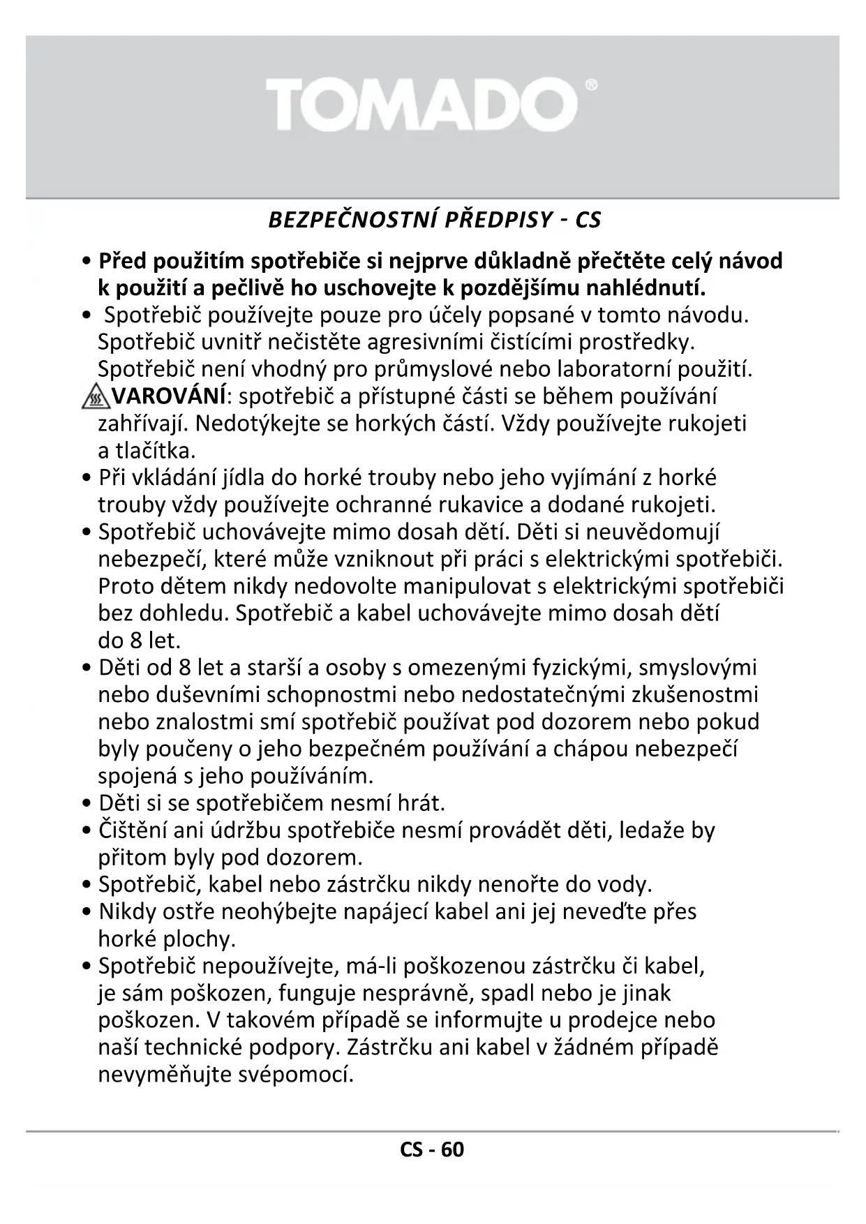 - Spotbrebič používejte pouze pro účely popsané v tomto námodu. Spotbrebič uvnitř nečistěte agresivními Čistícími prostředky. Spotbrebič není vchodné pro průmyslové nebo laboratorní použití.