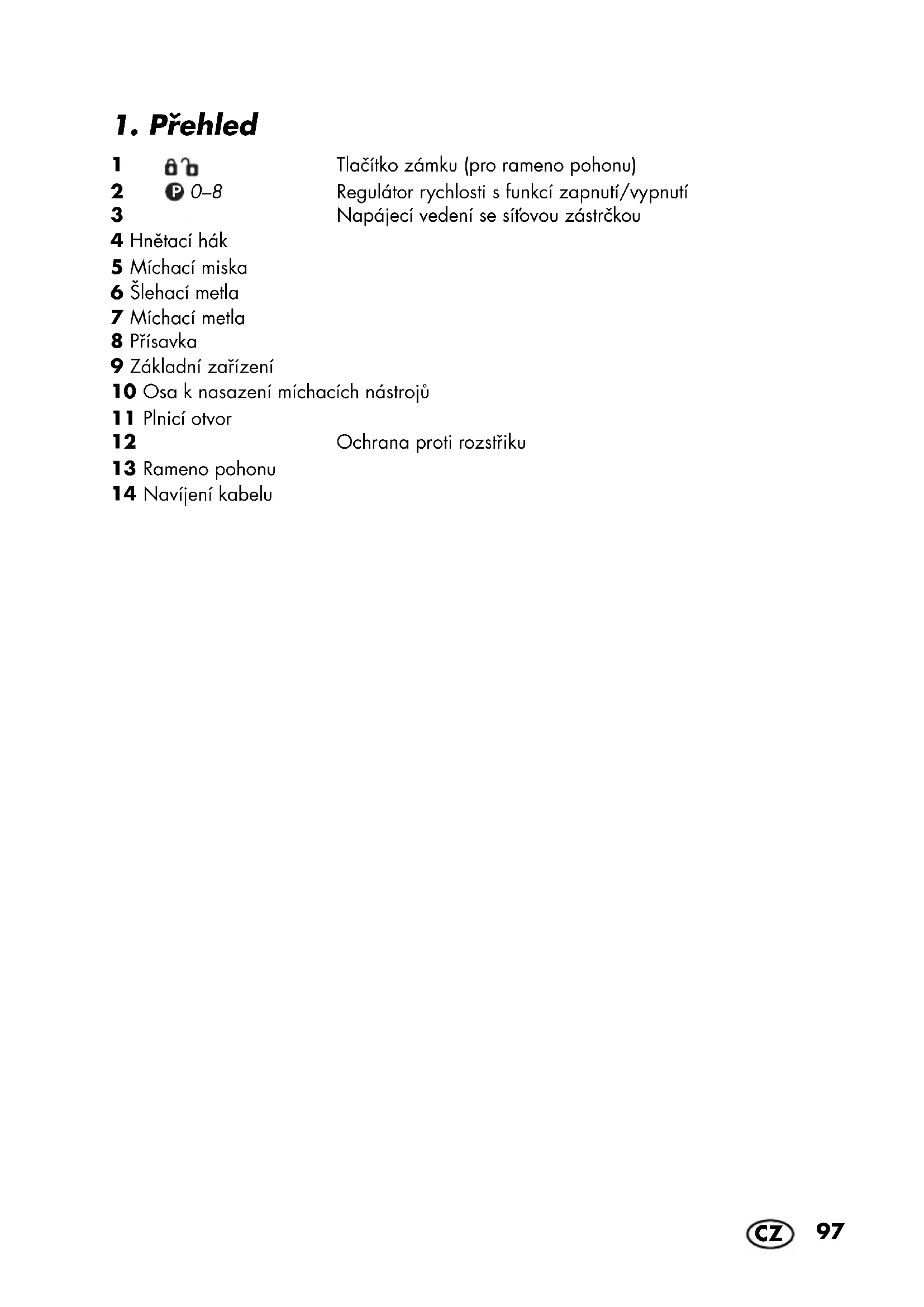 1 Tlačítko zámku (pro rameno pohonu) 2 0–8 Regulátor rychlosti s funkcí zapnutí/vypnutí 3 Napájecí vedení se síťovou zástrčkou 4 Hnětací hák 5 Míchací miska 6 Šlehací metla 7 Míchací metla 8 Přísavka 9 Základní zařízení 10 Osa k nasazení míchacích nástrojů 11 Plnicí otvor 12 Ochrana proti rozstřiku 13 Rameno pohonu 14 Navíjení kabelu