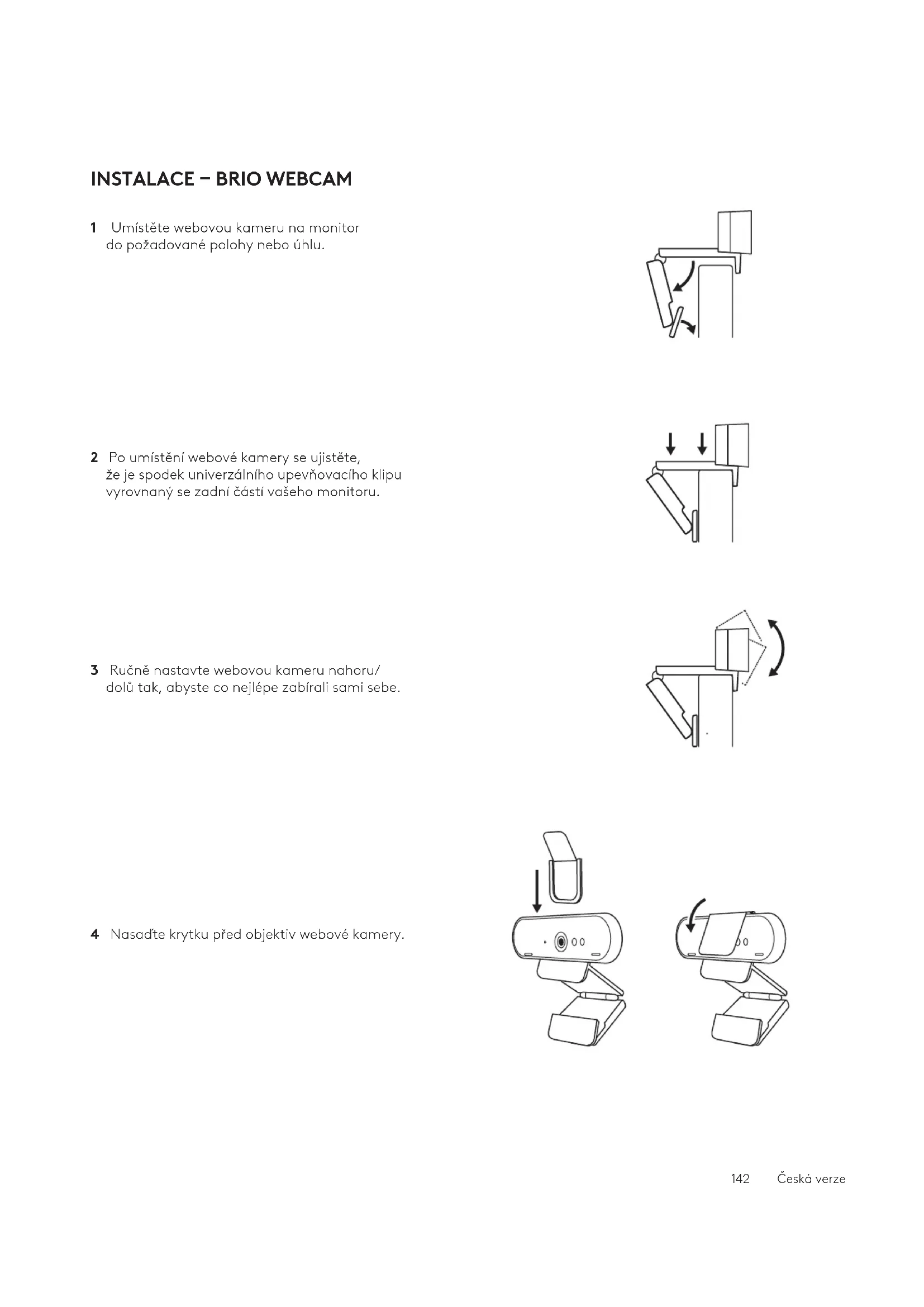 141 Česká verzeINSTALACE – BRIO WEBCAM 1 Umístěte webovou kameru na monitor dopožadované polohy nebo úhlu. 2 Po umístění webové kamery se ujistěte, žejespodek univerzálního upevňovacího klipu vyrovnaný se zadní částí vašeho monitoru. 3 Ručně nastavte webovou kameru nahoru/ dolůtak, abyste co nejlépe zabírali sami sebe. 4 Nasaďte krytku před objektiv webové kamery. 142Česká verzeINSTALACE – SADA ORGANIZÉRU KABELŮ USB-C 1 Očistěte povrch. Odlepte pásku. 2 Silou přitiskněte poutko na několik sekund kestolu. 143Česká verzeVARIANTY INSTALACE UPEVŇOVACÍHO DRŽÁKU Varianta 1 Upevněte Logi Dock ke stolu pomocí 2 přiložených šroubů. Varianta 2 Upevněte Logi Dock ke stolu pomocí oboustranné lepicí pásky VHB jejím přitlačením ke spodku držáku. Varianta 3 Připevněte Logi Dock ke stolu pomocí zámku Kensington.*